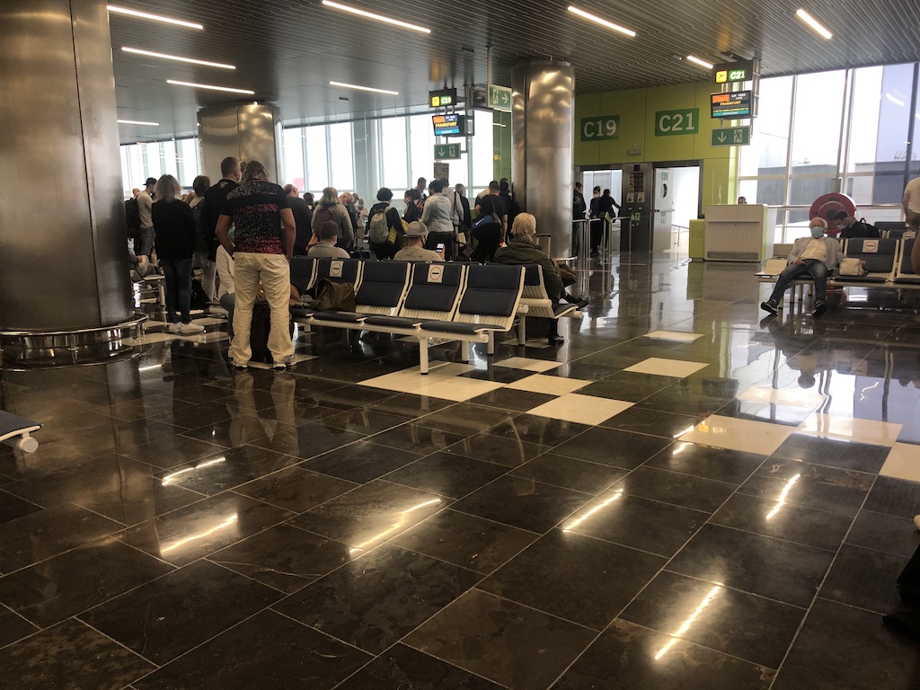 Das Chaos ging am Gate weiter: die beiden Abflüge nach Frankfurt fanden beinahe zeitgleich statt. Einer von Gate C19, der andere direkt daneben von C21. Es kam zur Verwirrung bei Fluggästen, die Ansagen des Personals am Gate waren kaum zu verstehen.