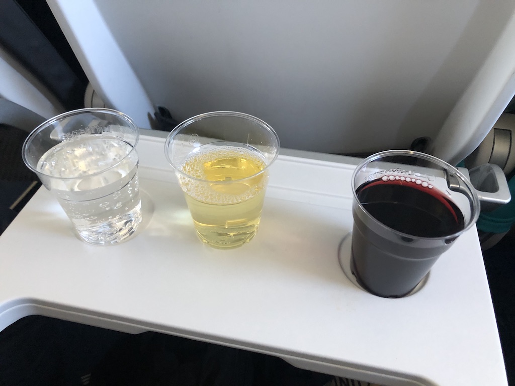 Zahlreiche Getränke waren nicht mehr verfügbar, Weißwein und Tonic waren warm, Eiswürfel sind wohl schon auf dem Hinflug geschmolzen und auf Zitronen wird gerade verzichtet. Dies führte zu weiteren Diskussionen mit den Passagieren, während die Crew durch den vollen Gang jonglierte.