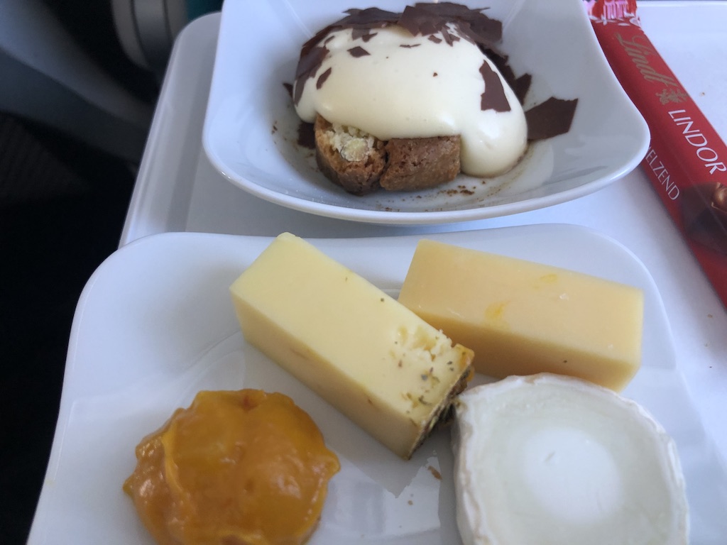 Im wilden Durcheinander wurde mir ein Tablett mit Vorspeise, warmen Hauptgang, Käse und Dessert gereicht. Nach einer Weile hat auch ein Brötchen den Weg zu mir gefunden und als ich schon beim Heilbutt war, gab es sogar etwas zu trinken. Anscheinend waren nicht genügend Gläser an Bord, Wasser & Wein kamen in Plastikbechern. Diese Tatsache ist einem Passagier so schlecht aufgestoßen, dass sich dieser auffällig beschwerte und die Aufmerksamkeit aller Flugbegleiter auf sich gezogen hatte.