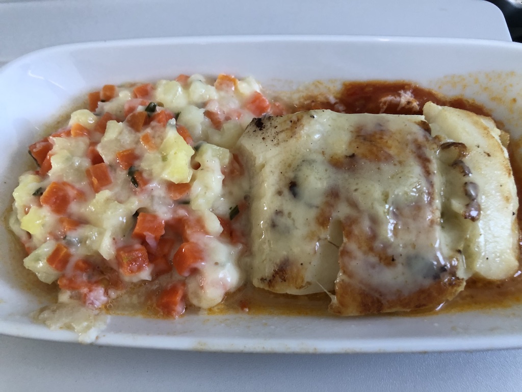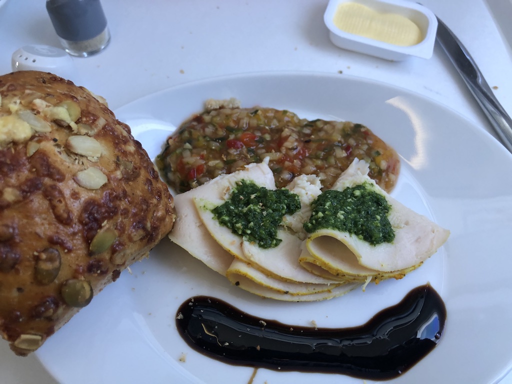 Das Essen an sich war in Ordnung, die kalte Vorspeisenplatte kennen manche bereits von Flügen innerhalb Deutschlands. Der Fisch war zart und geschmackvoll, mit Brot und den anderen Bestandteilen wurde man wirklich gut satt. Als wir in der dritten Reihe längst mit dem Essen fertig waren, hatten Gäste in den letzten Reihen noch kein Getränk.