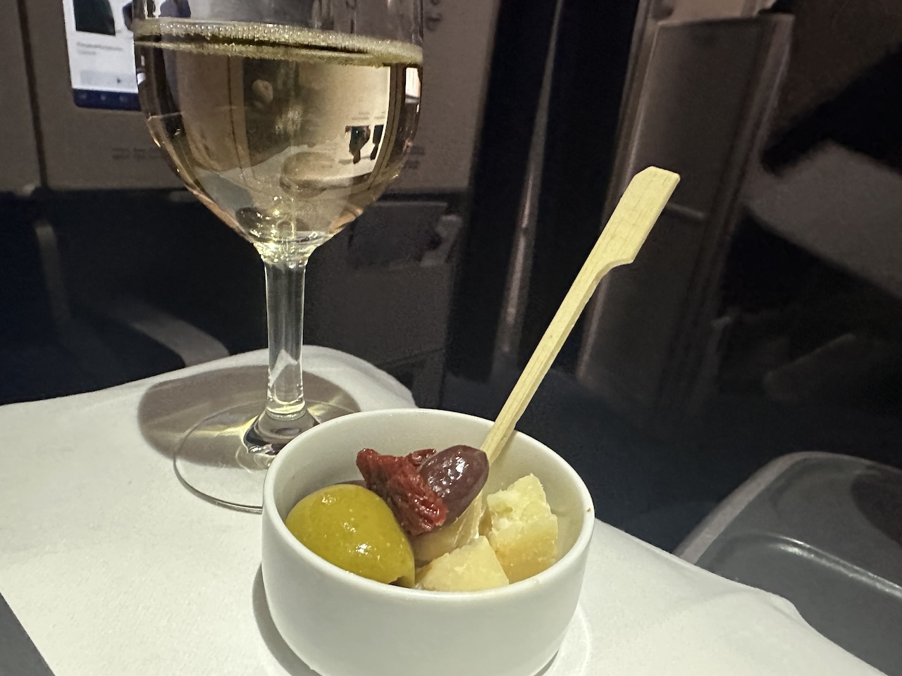 Nach dem Start wurden die Speisekarten und heiße Tücher gereicht. Dann wurde uns noch ein Aperitif angeboten, ich habe ein Glas Champagner bestellt, welcher kurze Zeit später mit einer Schale Antipasti serviert wurde.