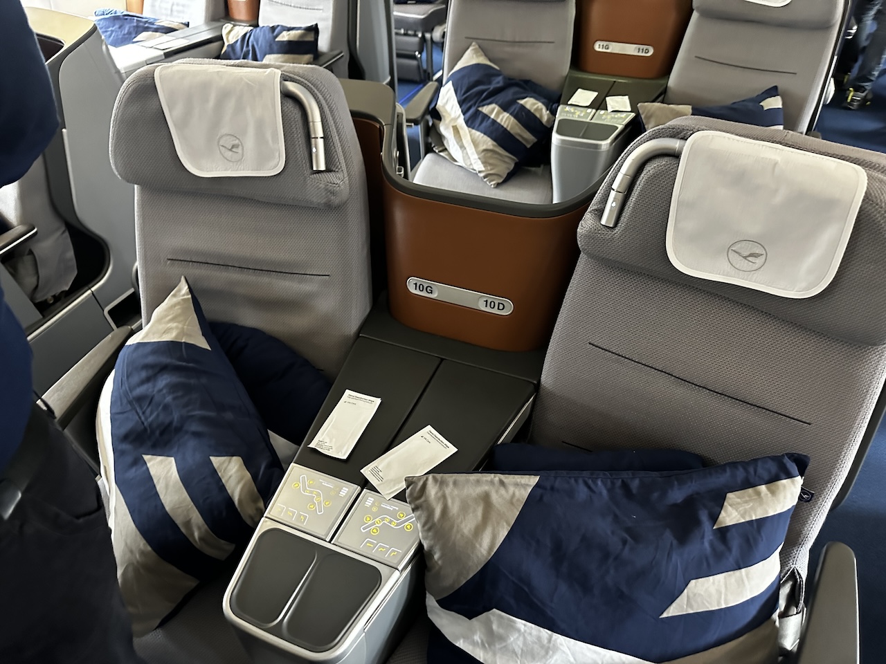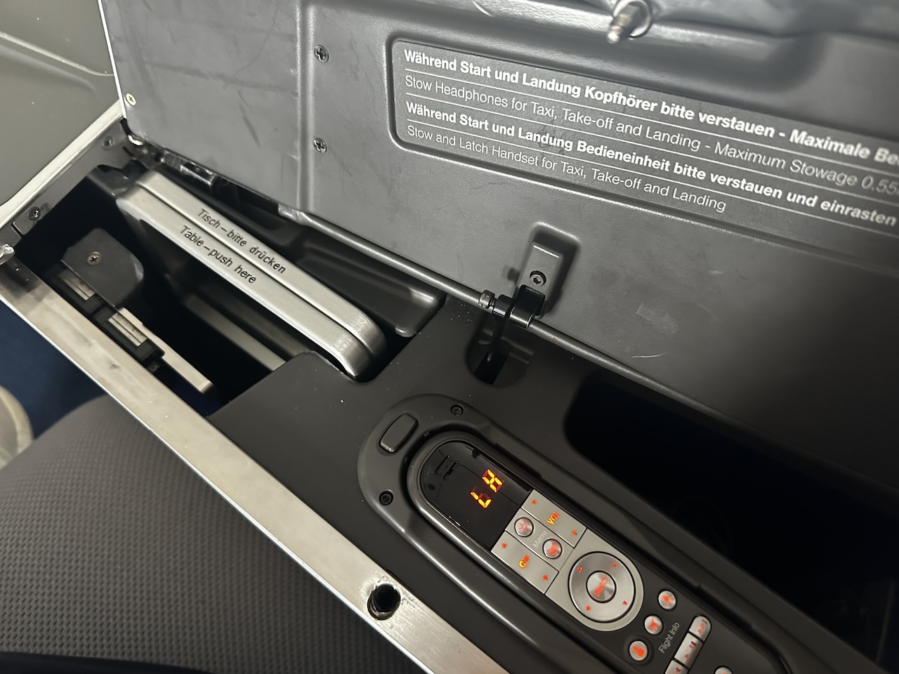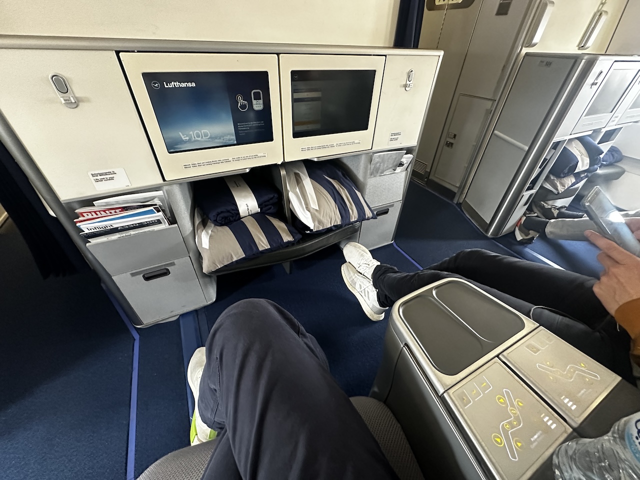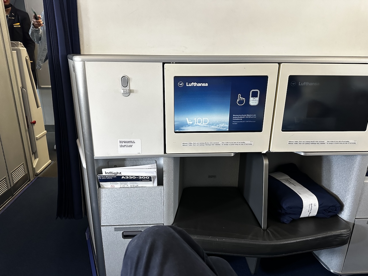 Den Sitz kennen viele von Euch, wir haben diesen auch schon in mehreren Reviews detailliert beschrieben. Mein Platz war heute 10D, ein Gangplatz in der ersten Reihe des kleineren Abteils. Im Vergleich zu den anderen Reihen sind die Monitore hier in einer Wand und nicht im Vordersitz installiert.