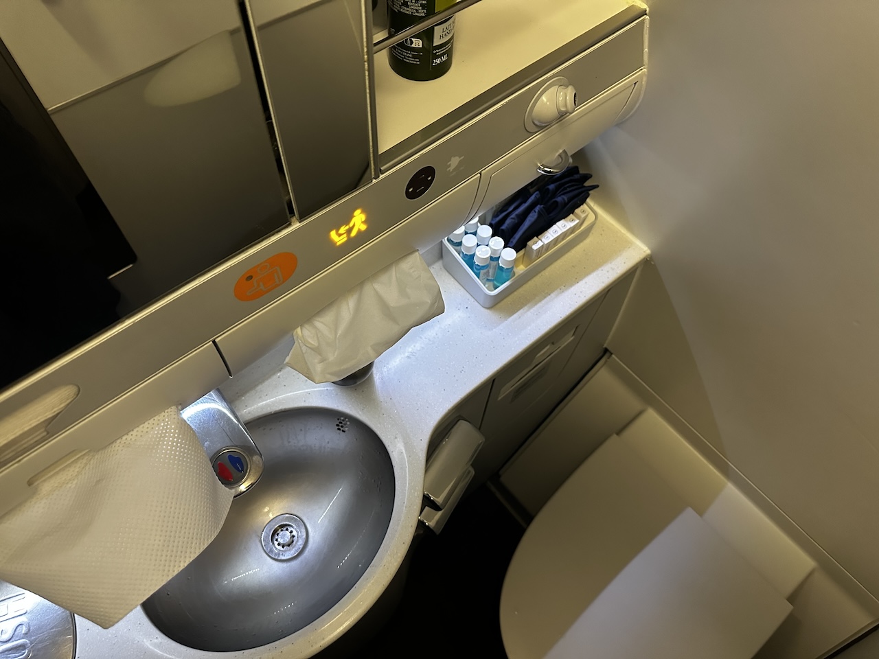 Auch die Galleys sind hier nicht weit entfernt, wer sichergehen möchte etwas mehr Ruhe zu bekommen, sollte lieber einen Platz in der Reihe dahinter oder dem vorderen Bereich wählen. Hier noch ein Blick in die Waschräume: