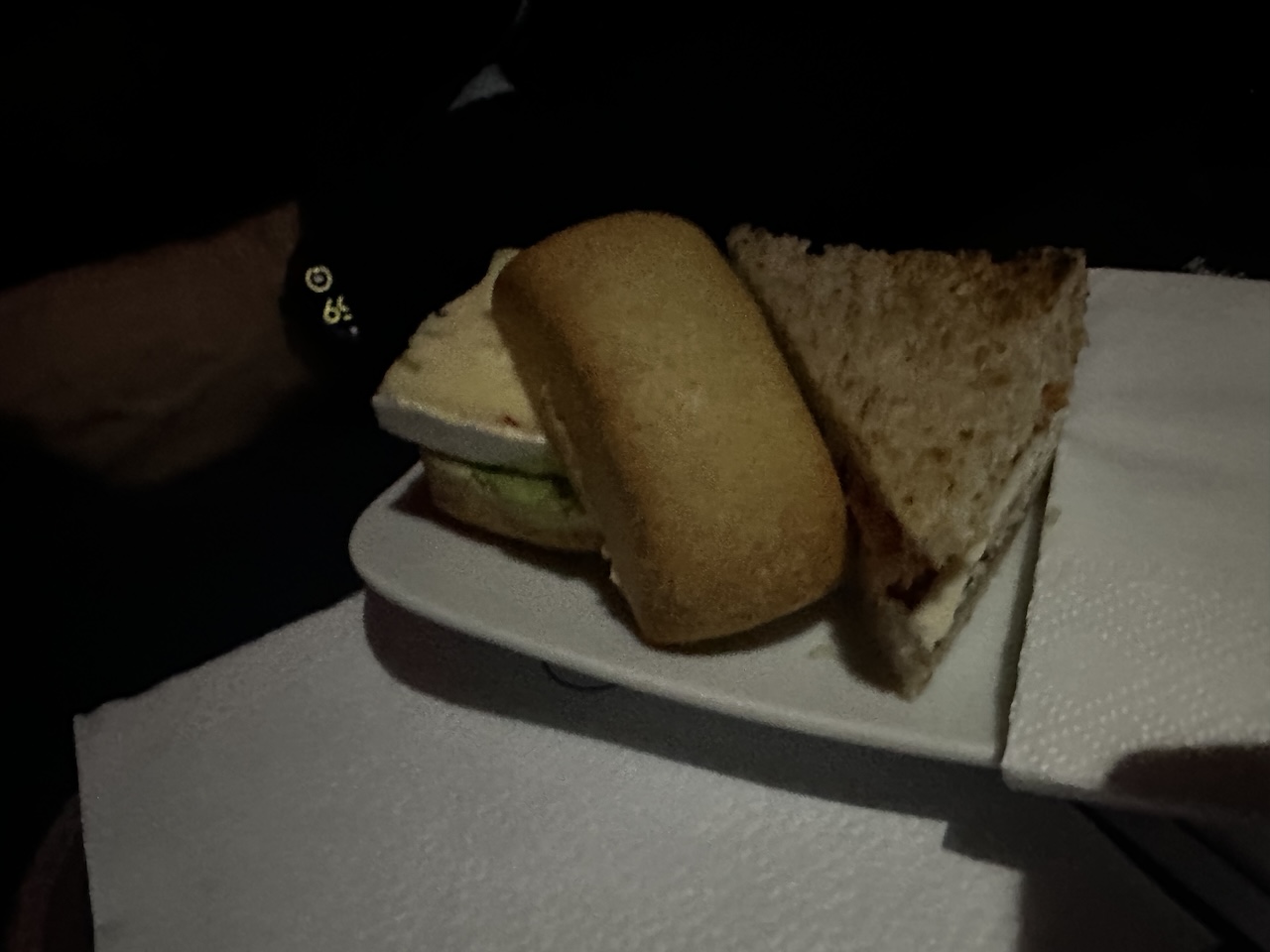 Der Flug startete zwar nachmittags, die Passagiere am Fenster hatten aber alle die Sonnenblenden geschlossen, daher war es in der Kabine dunkel. Die Reise dauerte weniger als 6 Stunden, ich konnte aber einen Film schauen und etwas nappen. Kurz vor der Landung gab es nochmal Getränke und ein Sandwich, wirklich hungrig war ich aber nicht.