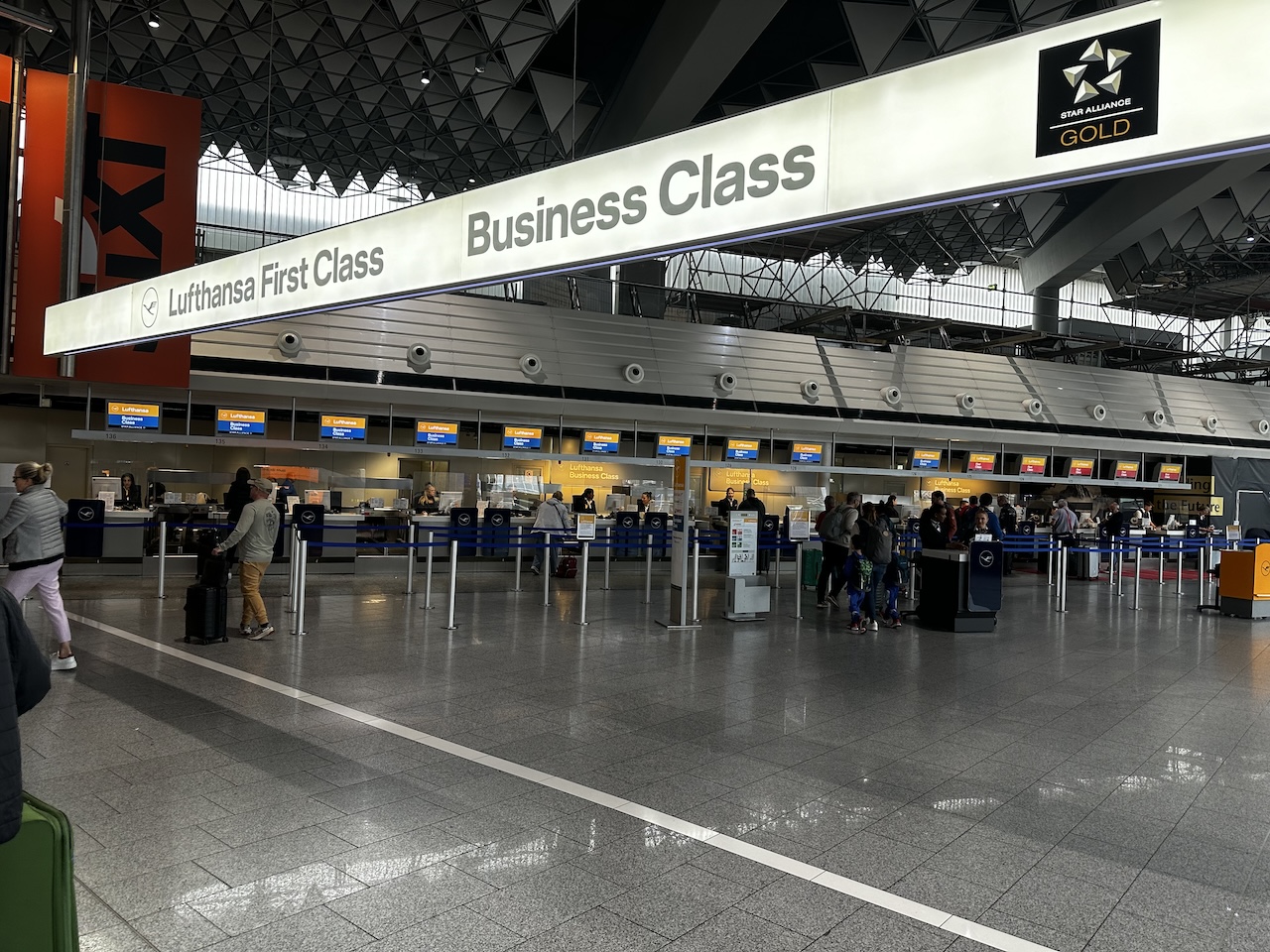 Unser Zubringer nach Frankfurt war ein ICE der Bahn, wir kamen pünktlich an und sind direkt zu den Check-In Schaltern im Terminal. Selbst an den Business Class Schaltern war viel los, es ging aber schnell voran. Inhaber einer Star Alliance Gold Karte dürfen übrigens auch im First Class Bereich einchecken und die Koffer dort aufgeben.