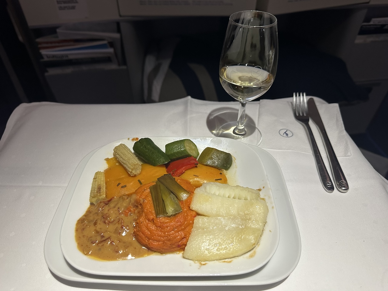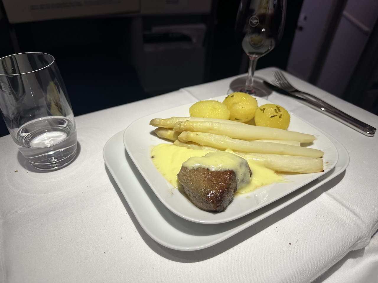 Einige Wochen im Jahr gibt es bei Lufthansa auch Spargel, dieser kam mit einem Stück Kalbsfilet. Alternativ gab es noch Fisch oder Pasta.