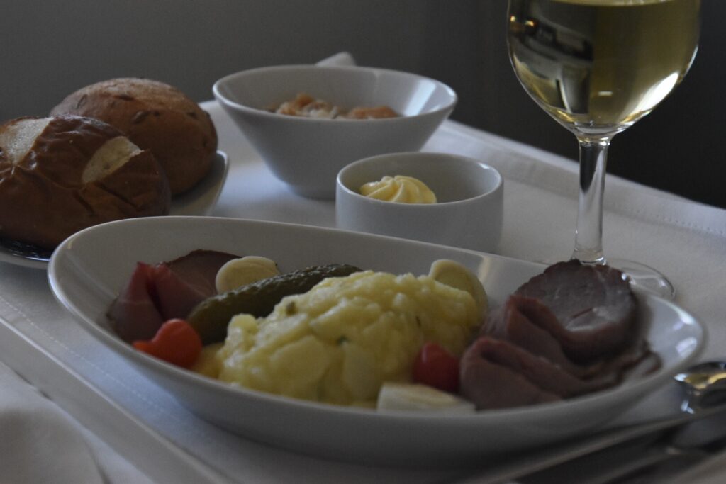 Etwa zwei Stunden vor der Landung gab es dann Abendbrot. Zur Wahl standen eine kalte Platte mit Aufschnitt & Kartoffelsalat dazu Brötchen, Butter und Nachtisch.
