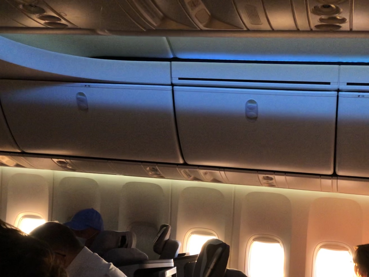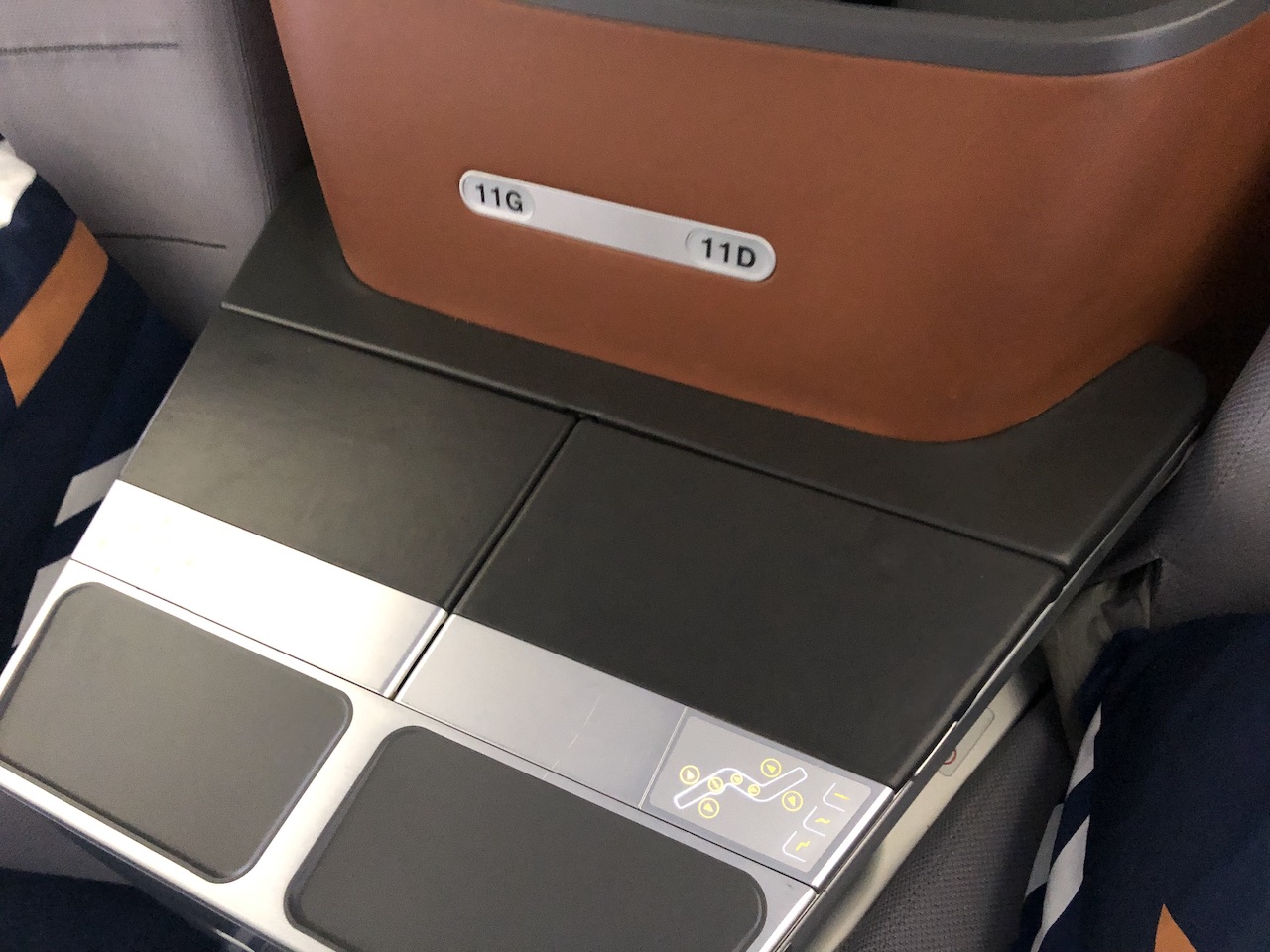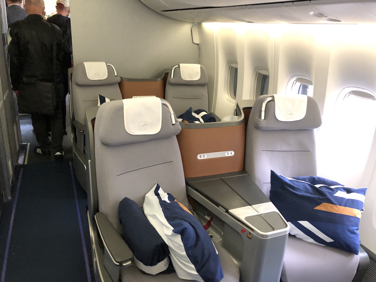 Beim Online Check-in hatte ich die Wahl zwischen zwei Sitzen im Oberdeck und einem Sitzpaar im hinteren Bereich des Hauptdecks. Ich kann beiden Varianten etwas abgewinnen, schätze die Privatsphäre oben aber auch das Raumgefühl unten. Heute wurde es 11C, die letzte Business-Sitzreihe. Der Platz befindet sich in einem kleineren Abteil mit nur zwei Sitzreihen und entsprechend Platz für 12 Fluggäste.