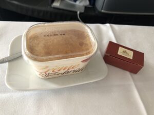 Die Vorspeisen wurden übrigens mit Salat und Brot getrennt im Vorfeld serviert, in den vergangenen Monaten kam dies samt Hauptspeise und Nachtisch auf einmal. Zum Abschluss gab es Käse und Eis sowie Kaffee und Digestif. Die Getränkegläser wurden stets nachgefüllt, dennoch wirkte die Flugbegleiterin nie gestresst und hatte immer Zeit für Smalltalk