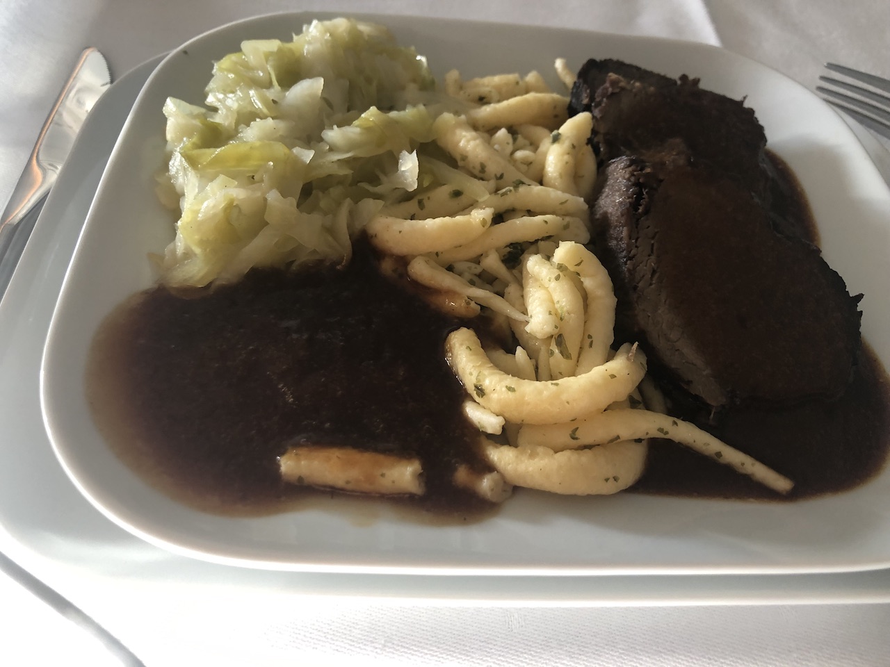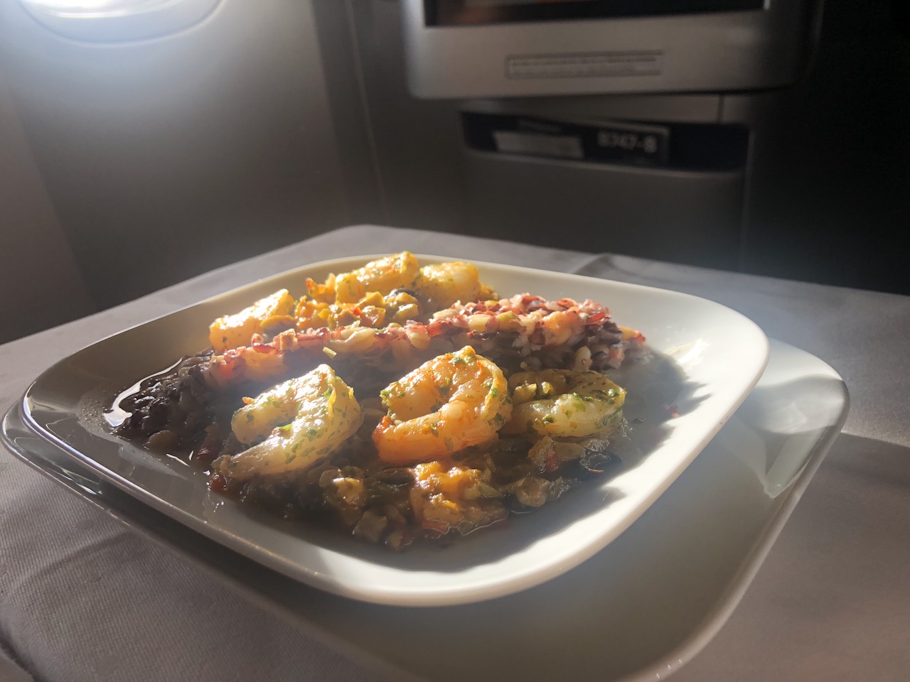Währenddessen konnten wir unsere Speisewünsche äußern. Heute hatte ich die Pasta in die engere Wahl genommen, musste mich aber für eine Alternative entscheiden. Anscheinend waren viele Vegetarier an Bord, die ihre Mahlzeit nicht vorbestellt hatten. Dem Charme der Stewardess konnte ich wirklich nicht entfliehen und habe ohne zu zögern das Rind genommen, mein Partner hatte sich für Garnelen entschieden.
