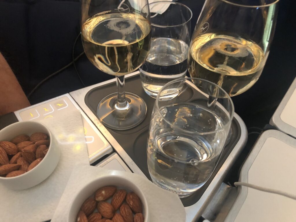 Neben dem Welcome Drink hat Lufthansa wieder fast alle Servicebestandteile von vor der Pandemie wieder zurückgeholt. Nachdem die Speisekarten verteilt wurden, kamen sogar wieder heiße Tücher zum Einsatz. Bei der Abfrage des Aperitifs gab es von der Flugbegleiterin noch einige Empfehlungen, unter anderem zwei Weine die nicht in der Karte waren. Wir haben uns zunächst für Champagner entschieden, dieser wurde mit Nüssen serviert. Einen Blick in die aktuelle Menükarte auf der Strecke findet Ihr hier.
