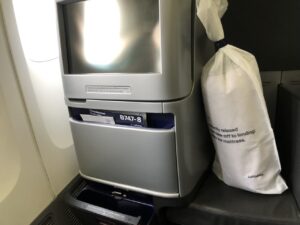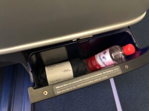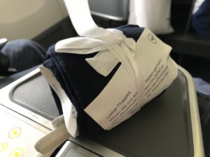 Am Sitz lagen Kissen, Decke und eine dünne „Matratze“. Auch das Amenity Kit und eine Wasserflasche waren wie gewohnt schon bereit.