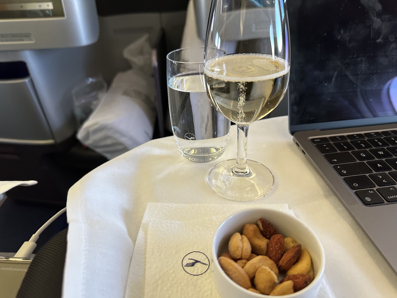 Als nächstes wurde ein Aperitif mit Nüssen serviert, die Mahlzeiten wurden abgefragt (Hier kommt Ihr zur Menükarte). Leider war meine erste Wahl nicht verfügbar, ein Vorbestellung funktionierte leider nur für Abflüge in Deutschland.