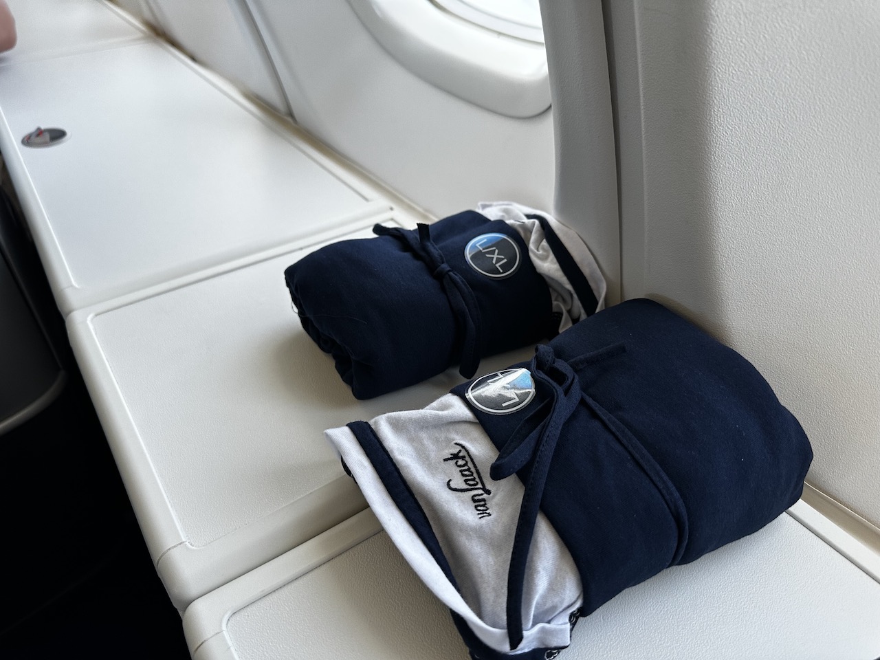 Auf längeren Flügen gibt es Sitzauflagen und Schlafshirts, an den Plätzen sind immer Amenity Kit und Wasserflasche.