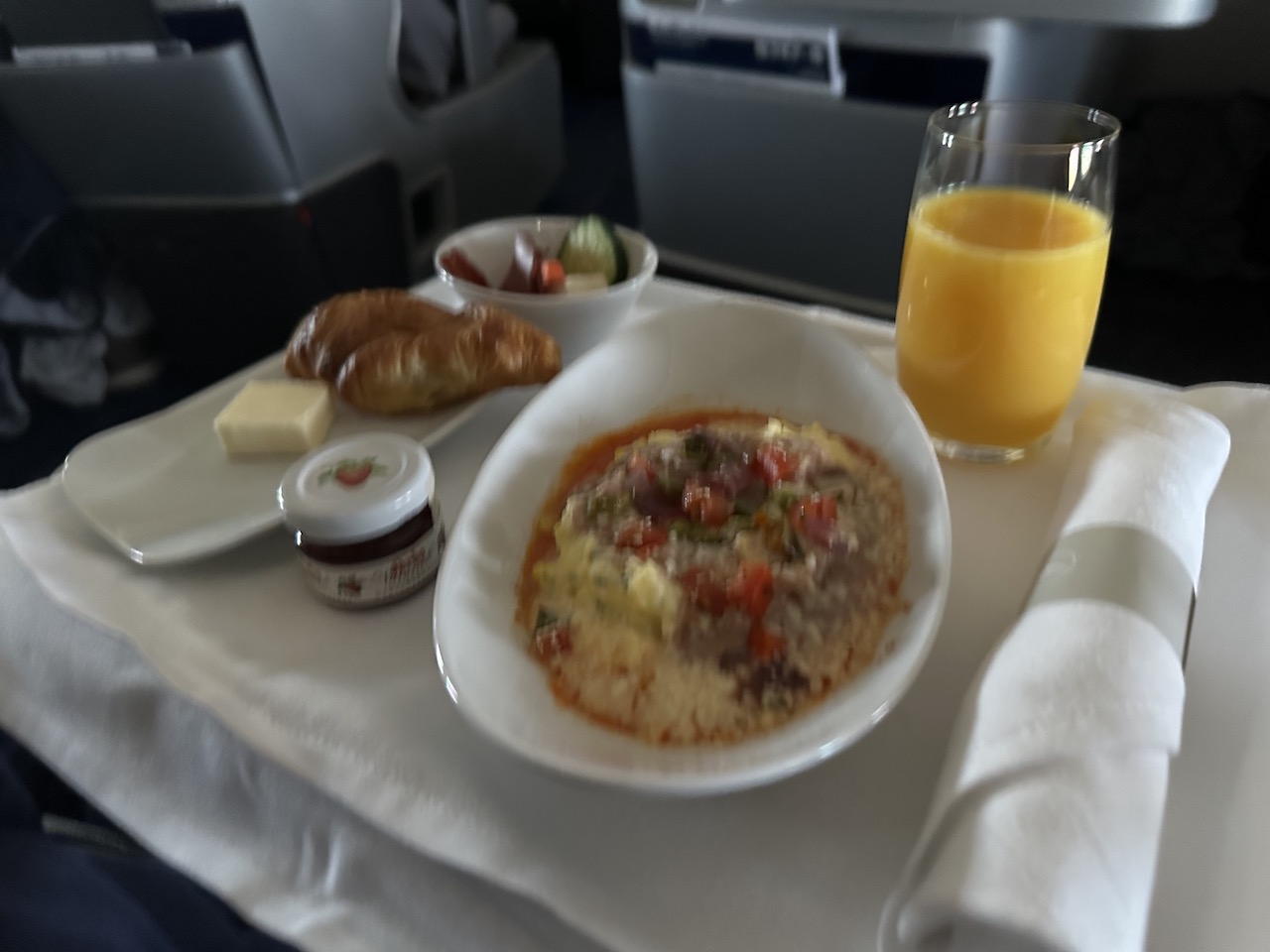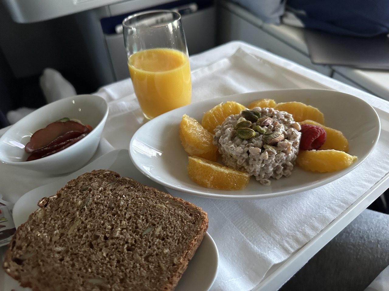 Die für uns zuständige Flugbegleiterin stellte sich bei allen Passagieren persönlich vor und füllte währenddessen nochmal die Gläser auf. Es folgten die Vorspeisen mit einer Brotauswahl.