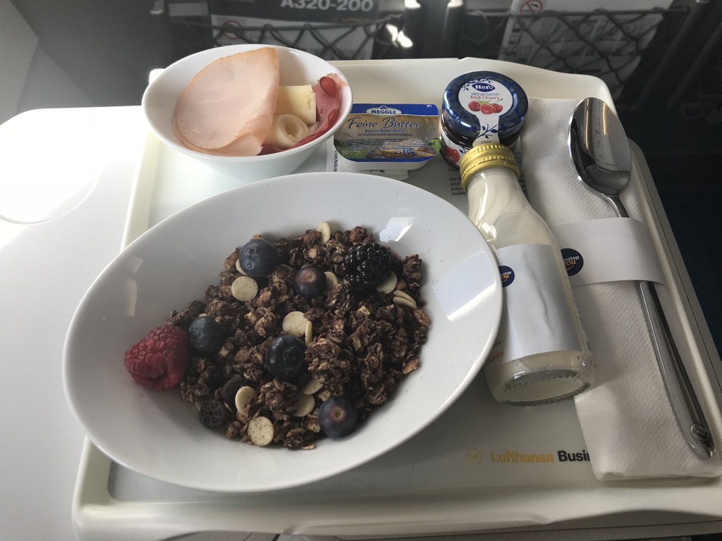 Noch am Boden gab es wegen der Wartezeit eine kleine Getränkerunde. Nach dem Start wurde direkt mit dem Service begonnen. Wir sind morgens geflogen, dementsprechend gab es Frühstück. Auf einem Tablett befanden sich Wurst, Käse, Marmelade, Butter, ein Schokomüsli mit Beeren und Milch. Warmes Brot und Brötchen wurden separat aus einem Brotkorb je nach Wunsch gereicht. Zum Essen gab es unlimitiert Kaffee und Tee, sowie Softdrinks und Alkoholika wie Bier, Sekt und Spirituosen.