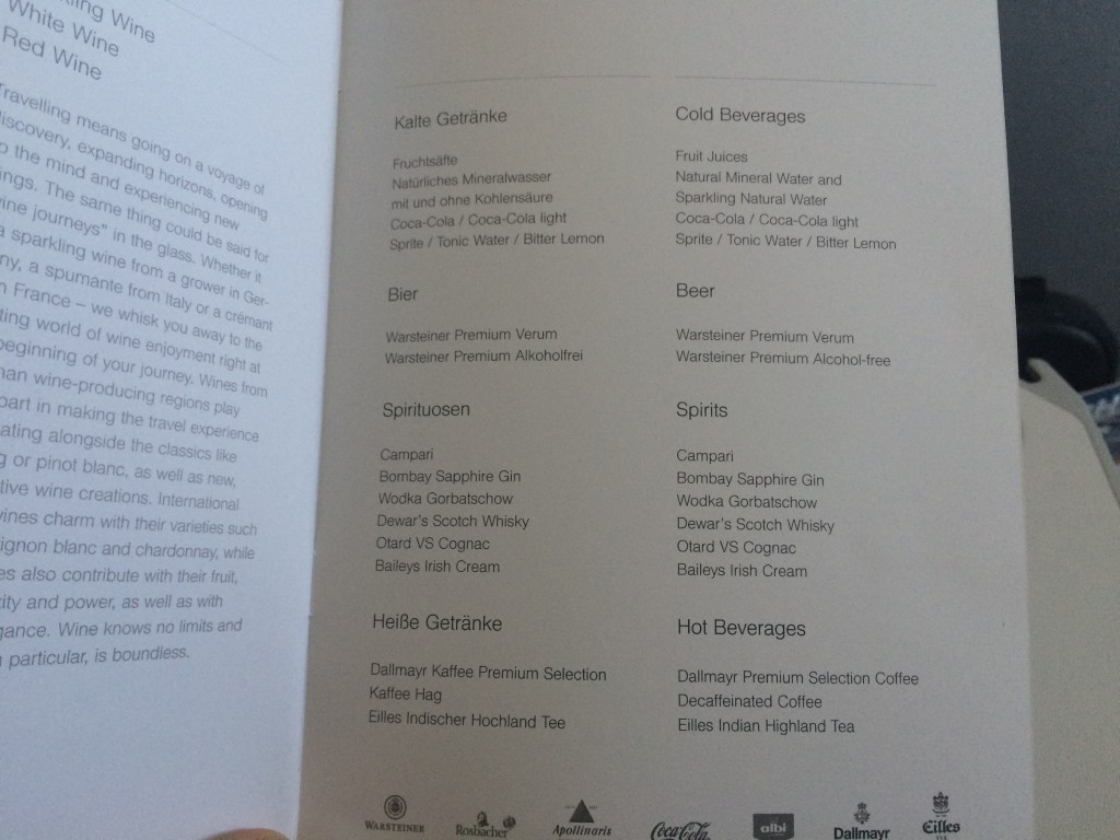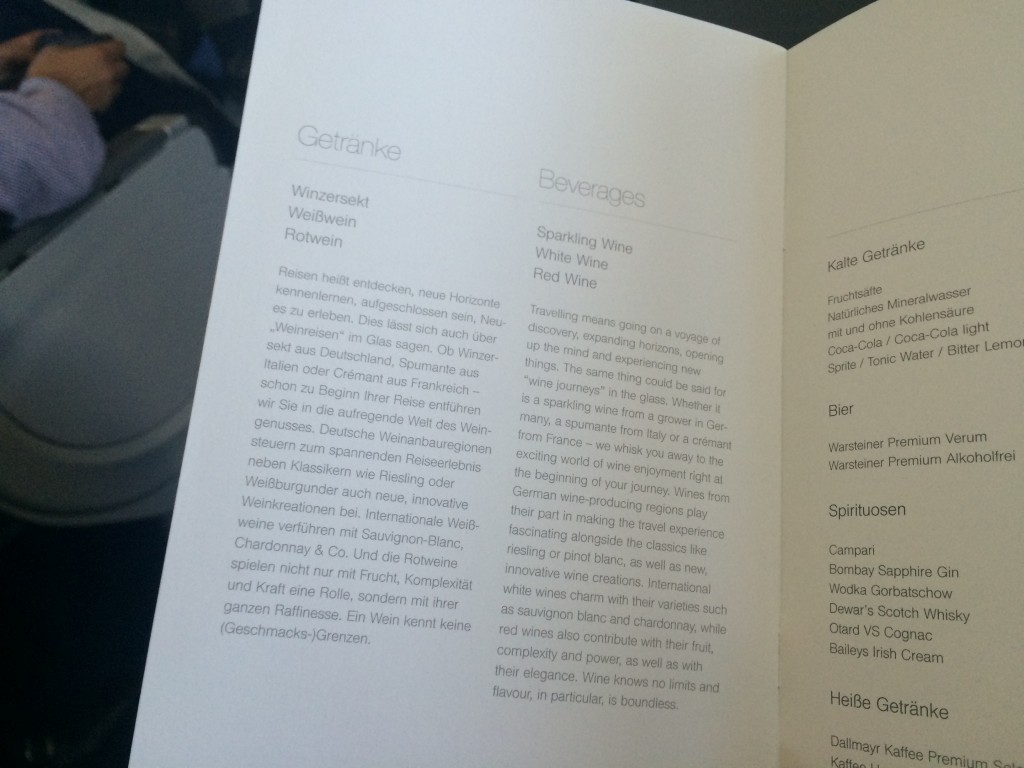 Kurz danach wurden Menükarten für den heutigen Flug verteilt und erste Getränke serviert. Die ersten zwei Reihen bekamen die Getränke direkt aus der Galley serviert, bevor der Getränkewagen in die Kabine gerollt wurde und die restlichen Passagiere ihren Aperitif serviert bekamen.