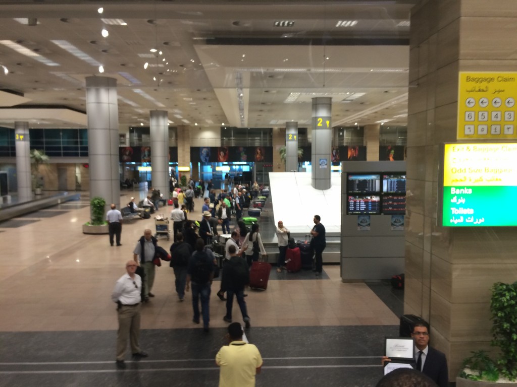 Nach der Ankunft im Terminal 3 in Kairo haben wir uns auf den Weg zur Immigration gemacht. Vorher mussten wir noch an den Bankschaltern direkt davor ein Visa on Arrival kaufen. Diese kosten 25 US$ pro Person und können nur in Bar in US$, oder Euro bezahlt werden. Allerdings wird Rückgeld nur in Ägyptischen Pfund ausbezahlt. Daher empfiehlt es sich einige US$ dabei zu haben.