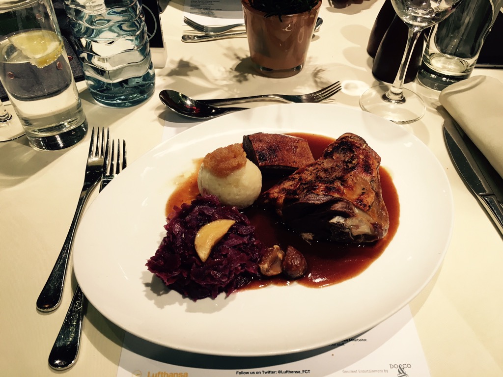 Das Essen wurde zusammen mit Vorspeise, Hauptspeise, Salat und Dessert auf einem Tablett serviert. Ich habe mich beim Hauptgang für den Sauerbraten entschieden. Schmorgerichte sind etwas, was man im Flugzeug gut zubereiten kann. Der Sauerbraten war auch, insbesondere für Flugzeugessen, sehr gut.