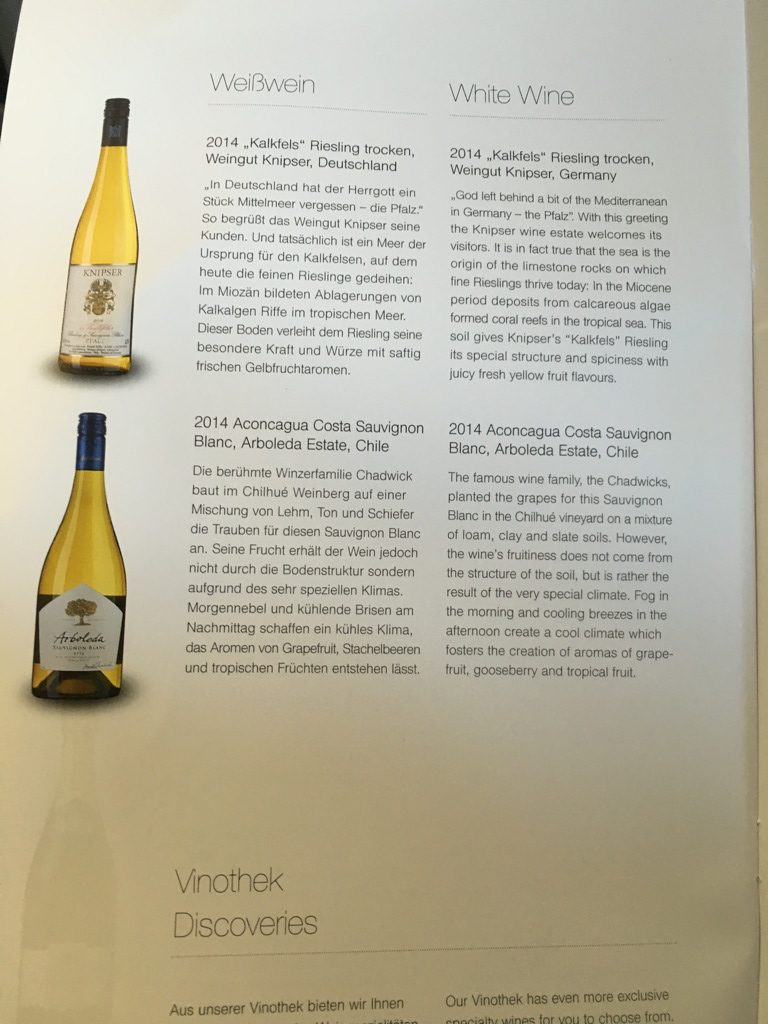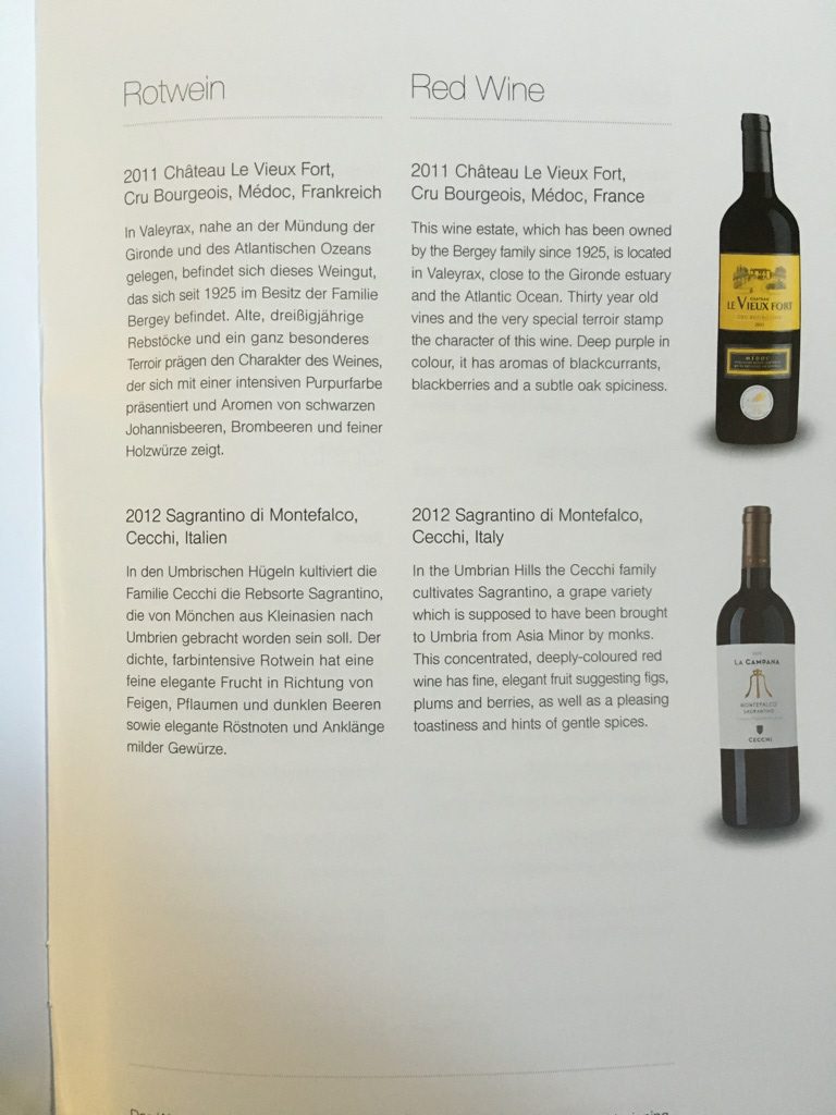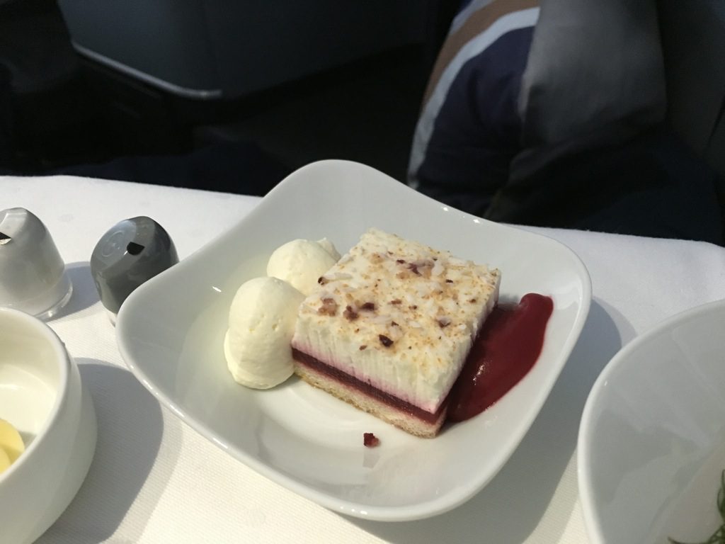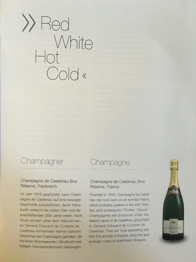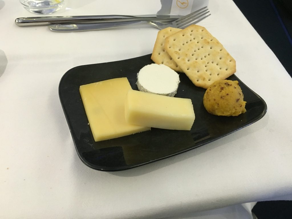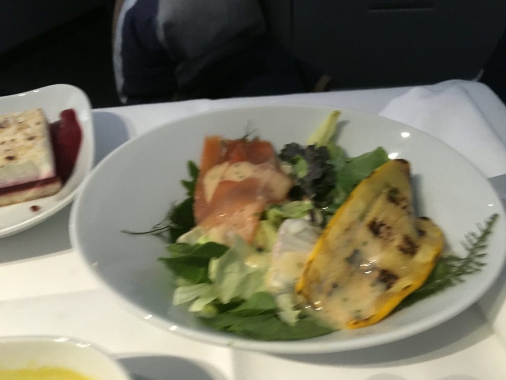 Grundsätzlich finde ich dieses Konzept ohne Tablett in der Lufthasnsa Business Class durchaus ansprechend, allerdings dauert es länger als früher, als einfach ein Vorspeisentablett überreicht wurde. Auch finde ich den Trolley im Gang, trotz Abdeckung, alles andere als ansprechend. Ich persönlich würde mir daher wünschen, dass man die Tische mit Tischdecke, Brotteller und Brotkorb, Butter, Salz und Pfeffer bereits beim Aperitif eindeckt und anschließend die Vorspeisen von einem Servierwagen serviert.