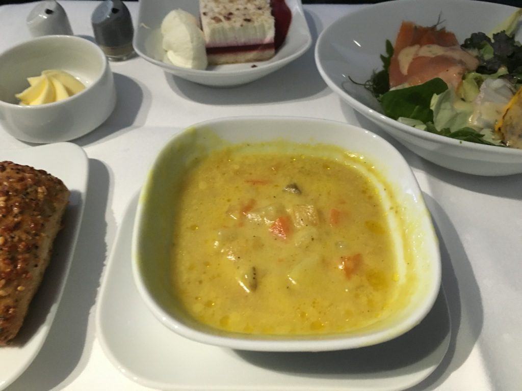 Auf Flügen nach Nord Amerika wird der zweite Service als „Soup and Salad“ bezeichnet. Und auch genau dies wird serviert. Neben einem Salad, gibt es eine warme Suppe, sowie Brot aus dem Brotkorb. Eine Auswahlmöglichkeit gibt es leider nicht.