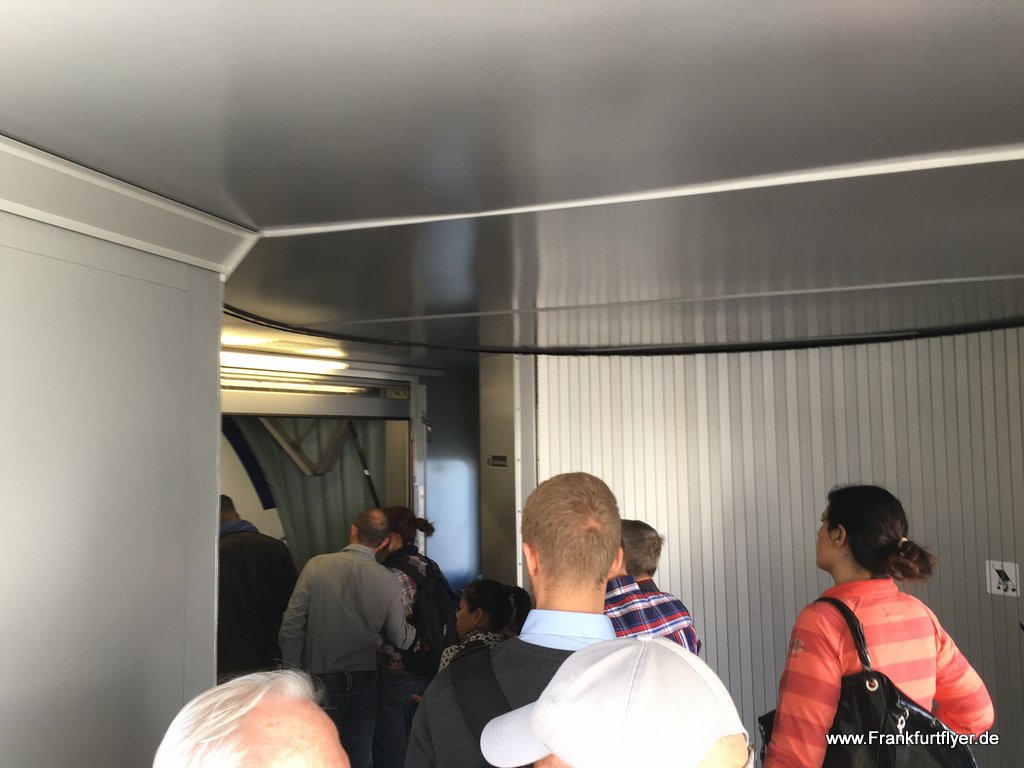 Nachdem ich aus der Swiss First Class Lounge A hinunter zum Gate gelaufen bin, war das Boarding schon im Gange und ich habe somit das Priority Boarding für die Business Class verpasst. Die Schlange vor dem Flugzeug war allerdings überschaubar und somit war alles kein Problem.
