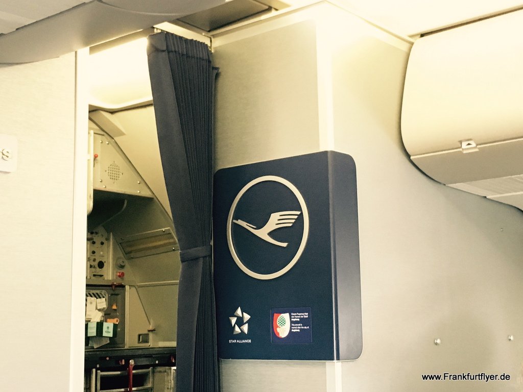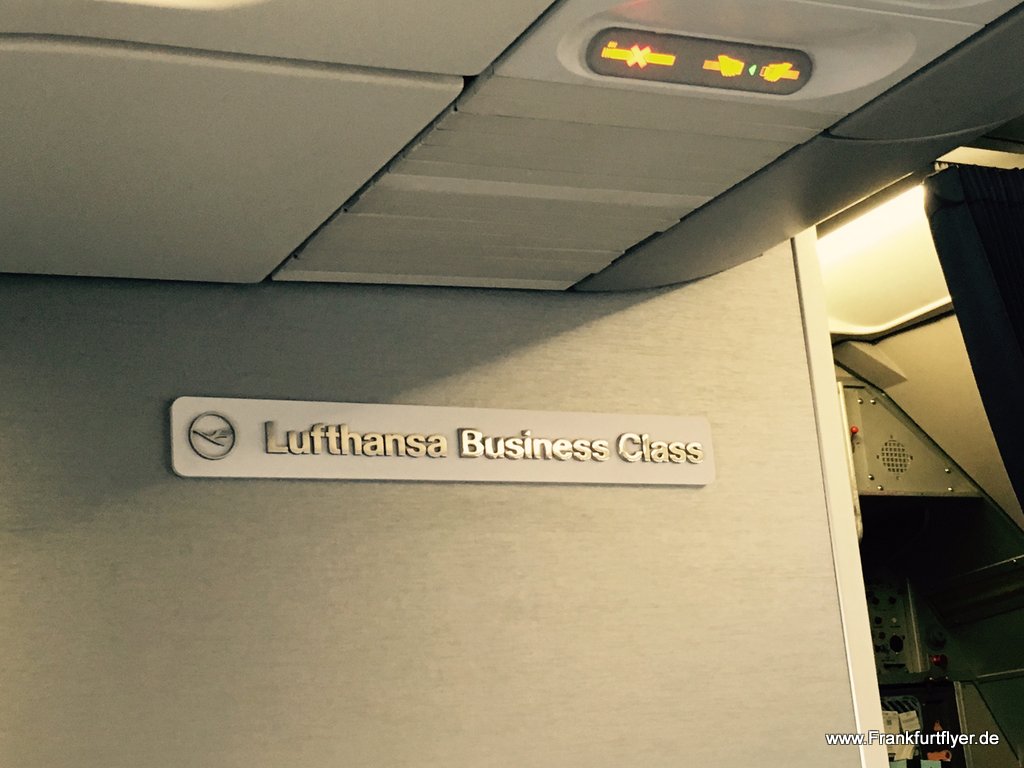 Man versucht die Business Class Kabine auch optisch von der Economy Class abzutrennen. So hat man bei Lufthansa einen Vorhang, welcher meist sehr penibel von den Flugbegleitern geschlossen gehalten wird. Wer vergisst, dass er in der Lufthansa Business Class Platz genommen hat, kann dies nochmals auf einem Schild an der Wand nachlesen 😉 .