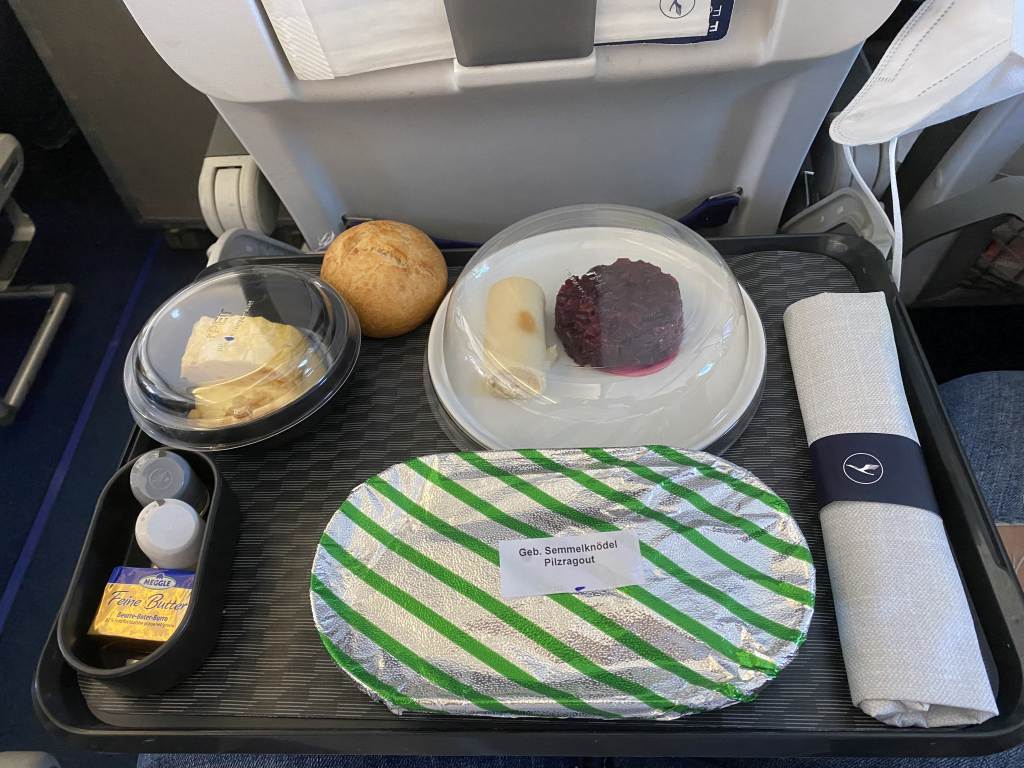 Ab Reihe 6 – also ab Hälfte der Business Class – gab es kein Fleischgericht mehr, sondern nur noch die vegetarische Variante.