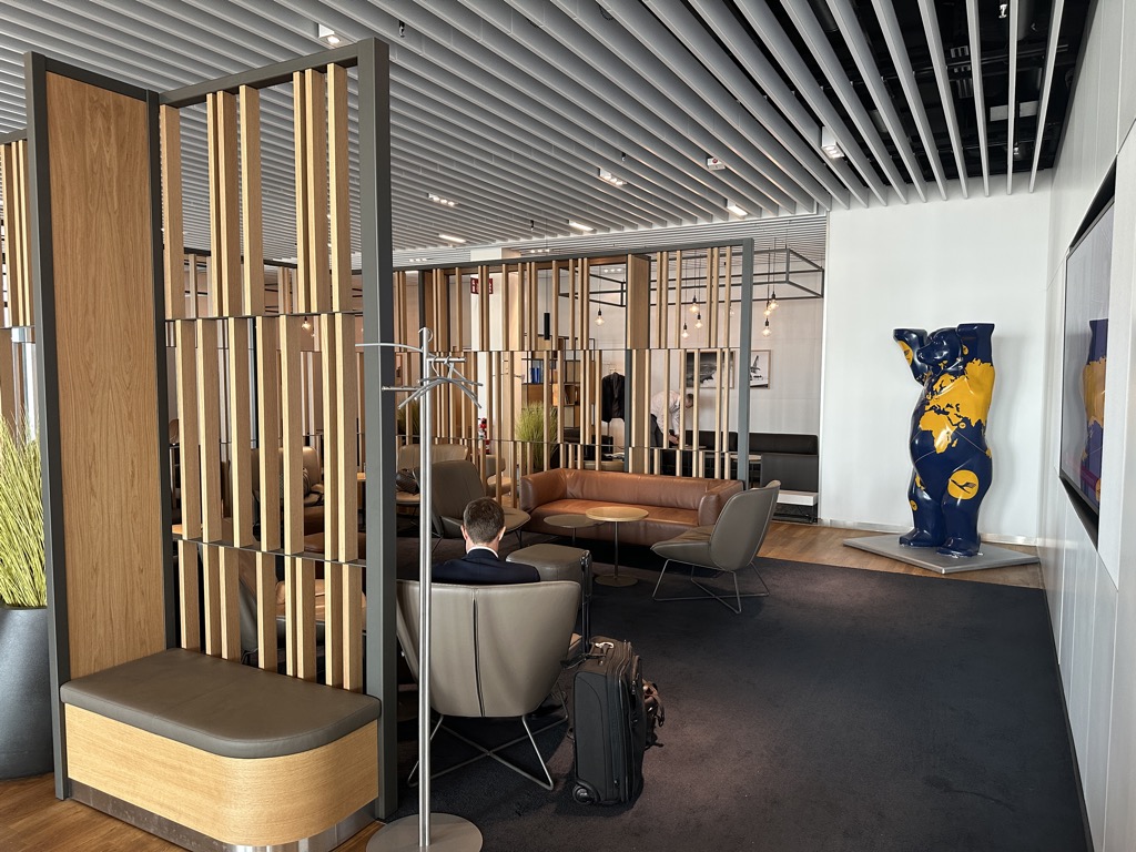 Blickfang in der Lufthansa Business Lounge Berlin ist klar der „legendäre“ Berliner Bär mit Lufthansa-Gewand, der bis 2020 im früheren Berliner Airport Tegel stand.