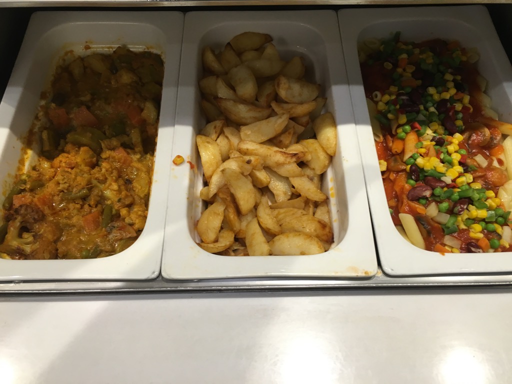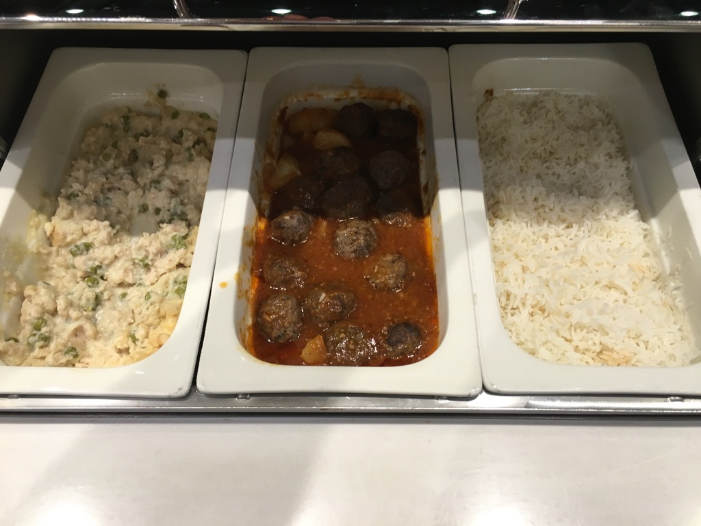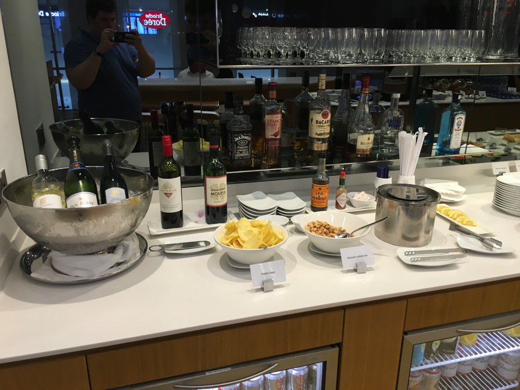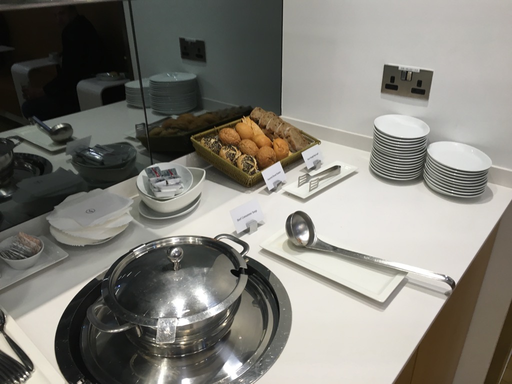 An einem Buffet werden Speisen und Getränke zur Selbstbedienung angeboten. Dabei ist das Angebot an Speisen für eine Lufthansa Business Lounge durchaus umfangreich, so dass man hier durchaus genug essen kann, um auf dem anschließenden Nachtflug komplett auf das Essen zu verzichten.