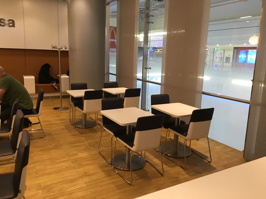 Rechts in der Lounge befindet sich die klassische Sessellandschaft, mit den üblichen Lufthansa Business Lounge Sesseln.