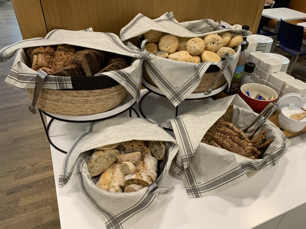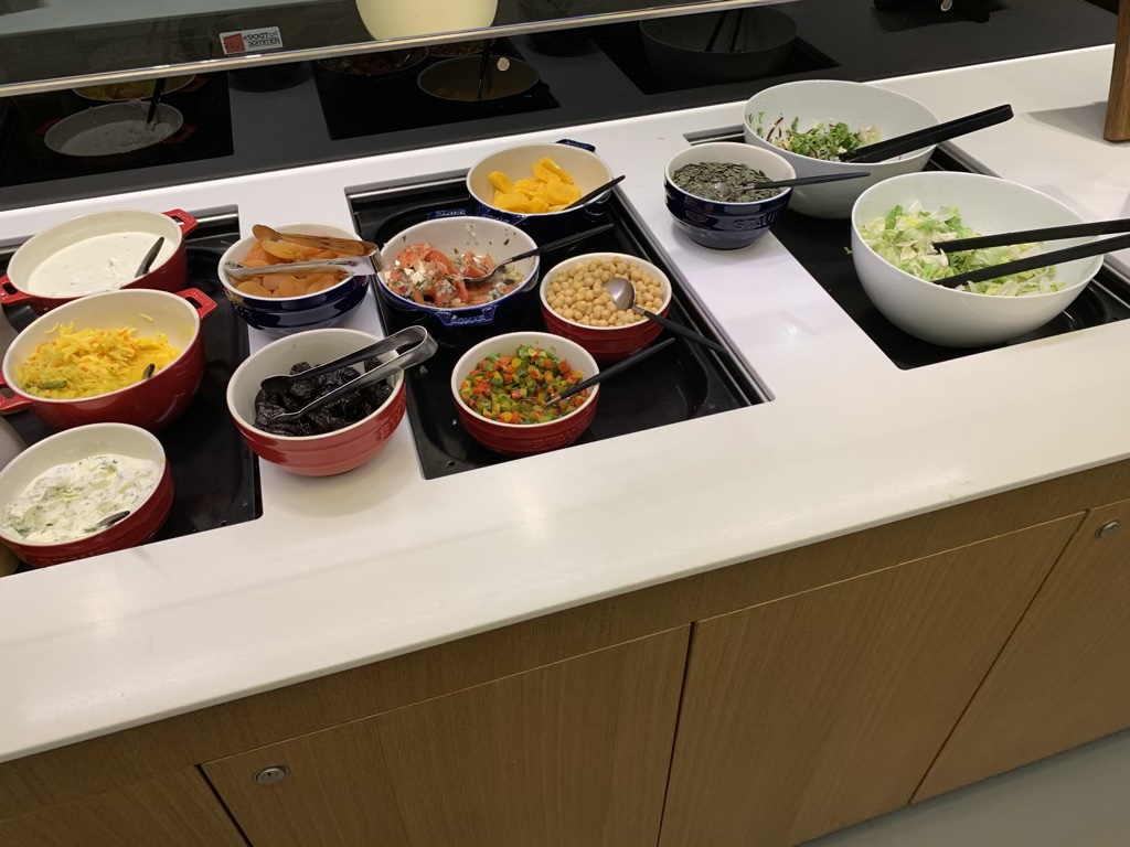 Wir haben die Lounge um die Mittagszeit besucht, das Catering war dementsprechend angepasst. Neben zwei warmen Alternativen gab es noch eine kleine Salatbar und eine Auswahl an Nachtischen. Selbstverständlich ist auch hier der typische WMF Kaffeevollautomat installiert. Beeindruckt hat Christoph die Spirituosenauswahl, welche für eine Business Lounge mit bspw. verschiedenen Sorten Gin nicht üblich war. Alle Speisen waren schön angerichtet. Das Buffet wurde regelmäßig gereinigt und aufgefüllt. Alles in allem hat das angebotene Catering einen guten Eindruck hinterlassen.