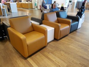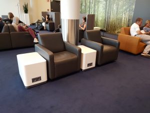 In der restlichen Lounge befanden sich verschiedene Lufthansa Lounge typische Sitzgruppen mit gemütlichen Sesseln, Zwischentischen und ausreichend vielen Steckdosen. Die Lounge war zum Zeitpunkt unseres Besuches recht voll, weshalb wir auf Bilder der Sitzgruppen verzichtet haben. Um Euch trotzdem einen Eindruck zu vermitteln, gibt es im Folgenden Bilder einer anderen Lounge, mit identischen Sitzgruppen.