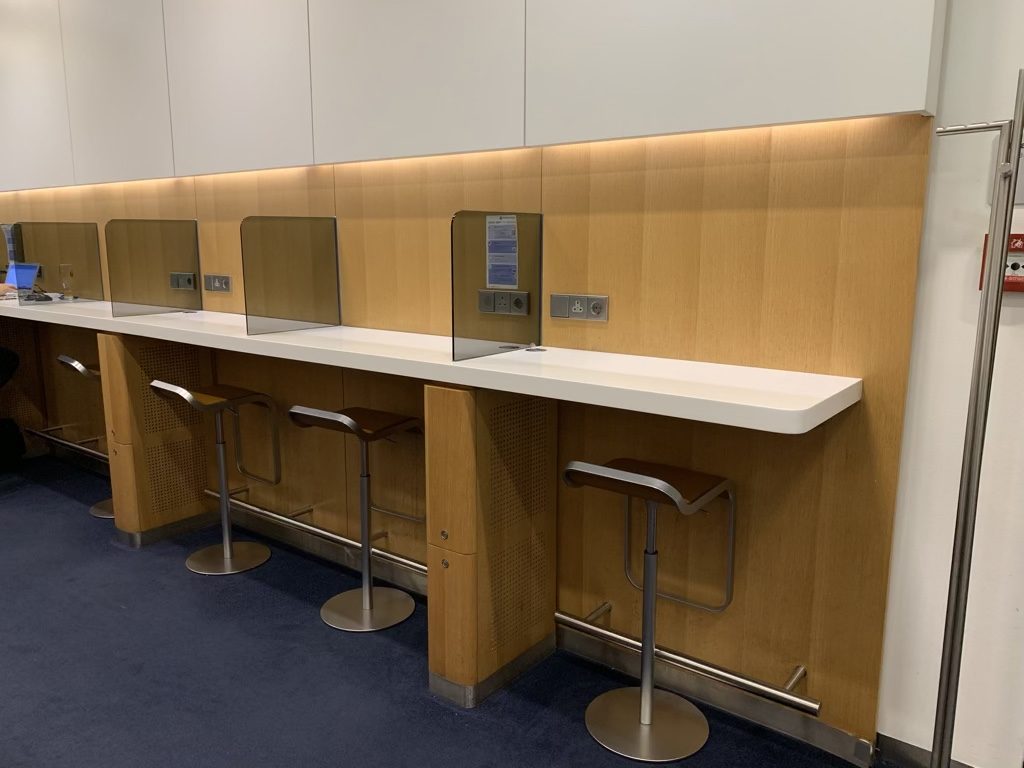 Beim Betreten der Lounge lief man links an einem Empfangstresen vorbei und stieß im Anschluss auf der rechten Seite auf ein kleines Business Center mit Hochtischen. An jedem Hochtisch waren Steckdosen angebracht, was wir immer sehr begrüßen.