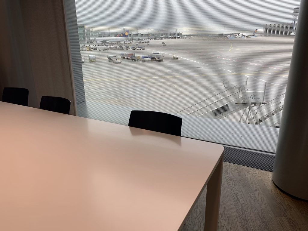 Im hinteren Bereich der Lounge gab es neben den üblichen Sesseln noch einen großen Tisch mit tollem Vorfeldblick. Insgesamt war die Lounge sehr hell, was nicht zuletzt durch die großen Fensterfronten kam.