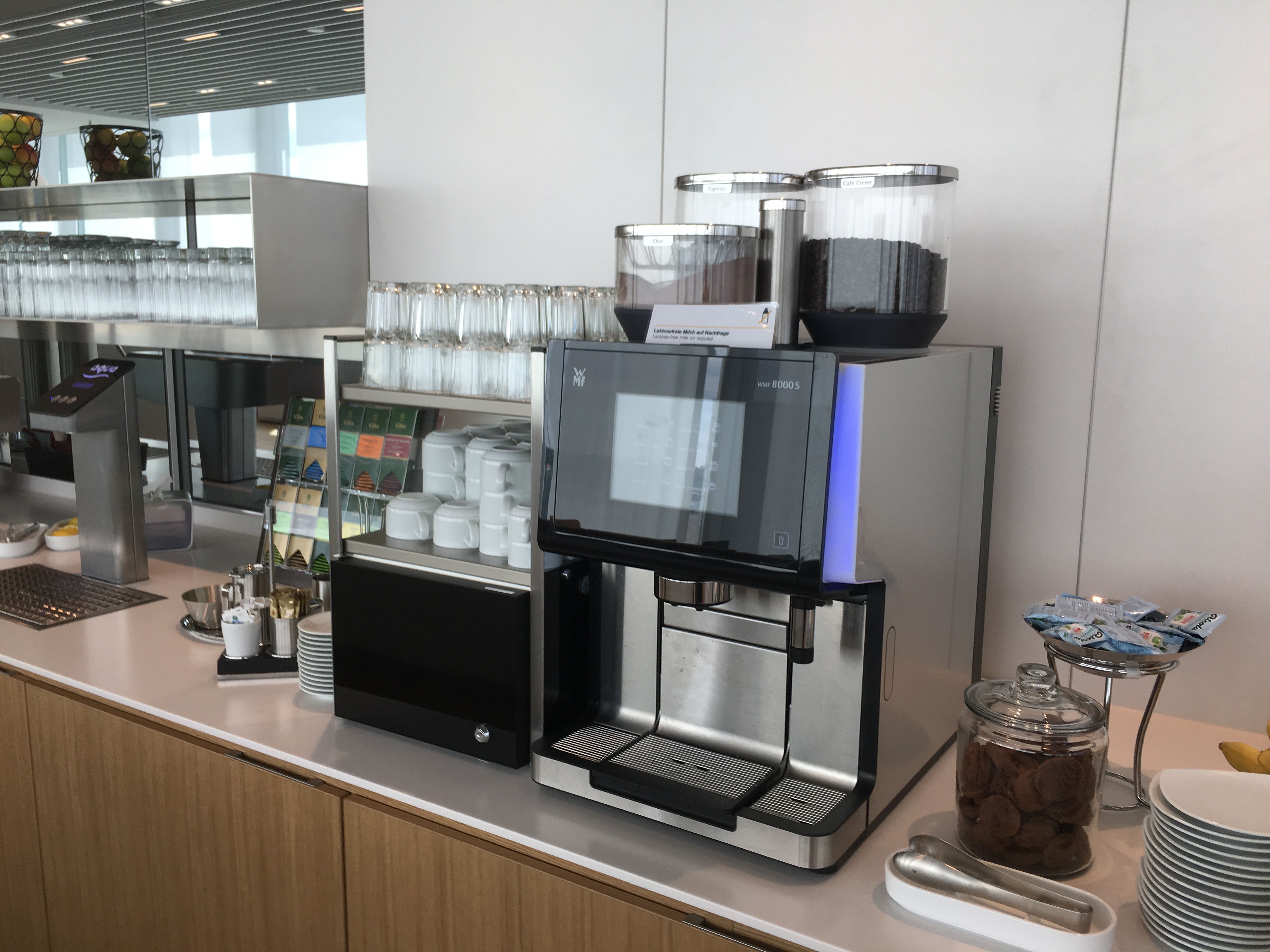 Was natürlich nicht fehlen darf in einer Lufthansa Lounge, ist der WMF-Kaffeevollautomat. Besonders am Morgen ist dieser im Dauereinsatz.