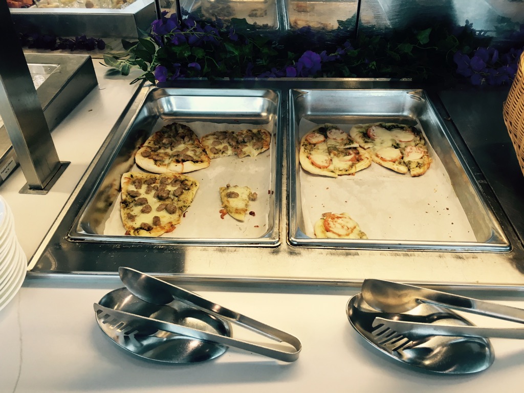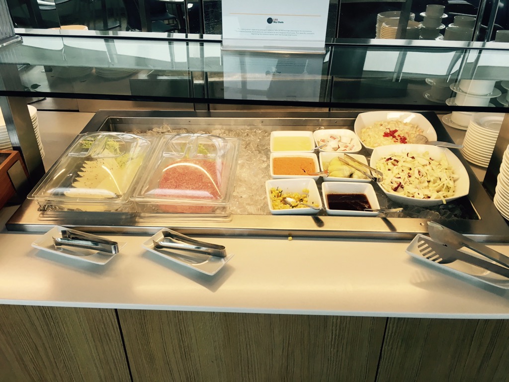 An einem Buffet wurden Speisen und Getränke zur Selbstbedienung angeboten. Das Angebot war dabei für eine Business Lounge überraschend gut und konnte fast mit der Senator Lounge ein Stockwerk höher mithalten. Neben einigen Salaten und kleinen Desserts, wurde auch Pizza angeboten.