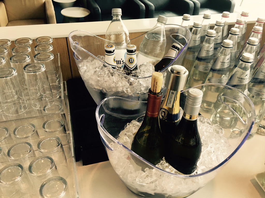 Die Auswahl an Getränken entsprach dem Lufthansa Business Lounge Standard. So gab es neben einigen Soft Drinks aus einem Spender auch Säfte, Wasser, Bier, Wein, Sekt und verschiedene Spirituosen.