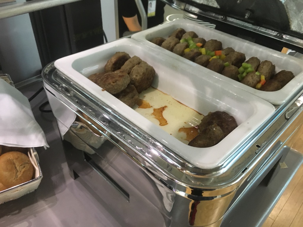 Bei meinem Besuch gab es neben einer Auswahl an Brot und Brötchen auch Salate, Frikadellen und ein Dessert. Leider war das Buffet von den kurz vorher nach München gestarteten Gästen abgegrast.