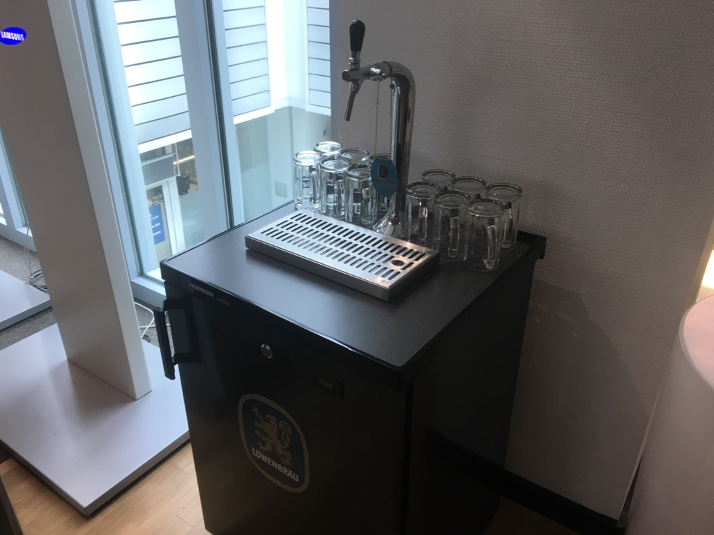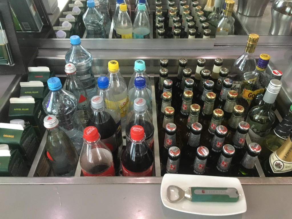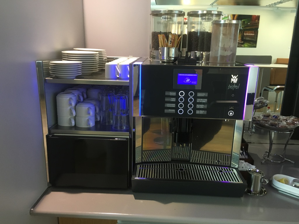 Die Auswahl an Getränken entsprach dem Lufthansa Business Lounge Standart. Neben einigen Soft Drinks, Säften und Wasser, gab es auch Bier und Wein, sowie Spirituosen. Die WMF Kaffeemaschine durfte natürlich auch nicht fehlen.