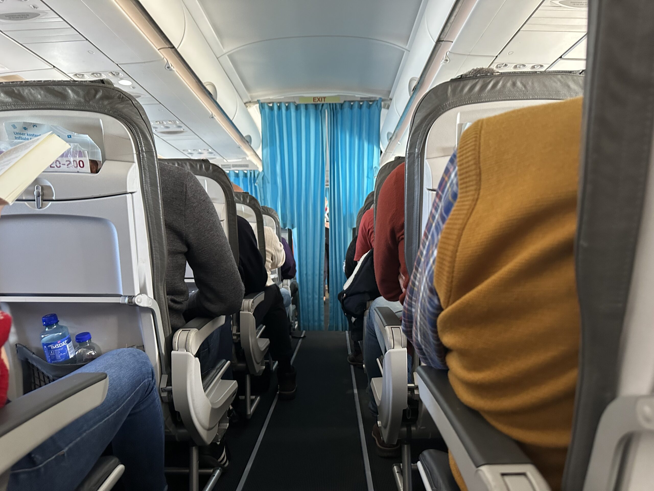 Ich habe ein Tag zuvor online eingecheckt und mir einen Gangplatz am Notausgang gesichert. Das Boarding startete etwas verspätet, wie fast immer durften Passagiere mit einem „PRE“ auf der Bordkarte zuerst einsteigen, dazu gehören Hilfsbedürftige und alle, die am Notausgang sitzen. Auch heute war ein Durchkommen zum Gate kaum möglich, da viele Passagiere längst am Drehkreuz ausharrten und in die Maschine wollten.
