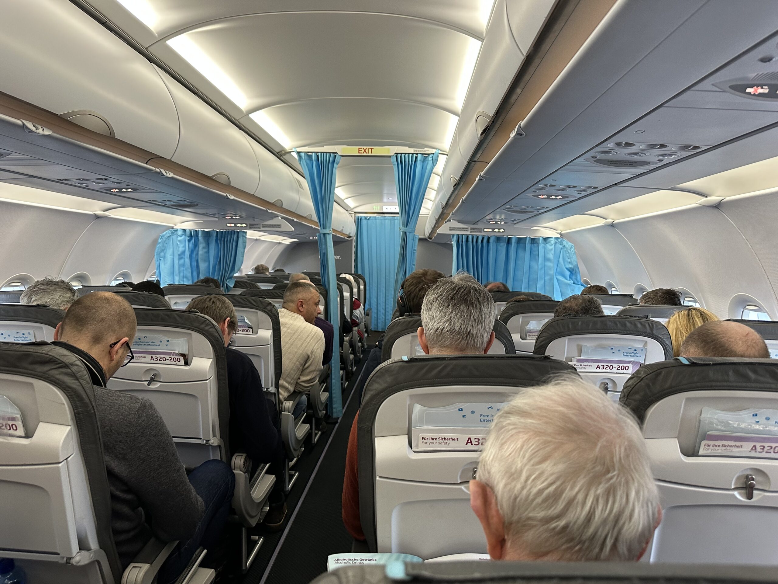Was unterscheidet diese EuroDisco-Maschine von einer LH-Maschine? Die Farbgebung, sonst nichts Gravierendes. Es ist nämlich eine ex LH-Maschine mit nach wie vor bis zu 180 Sitzplätzen (je nach Businessanteil). Somit ist da nichts zusätzlich reingequetscht. Man bekommt auch nicht „viel weniger Service“ als bei LH, dort gibt’s ebenfalls alles nur gegen Bezahlung.
