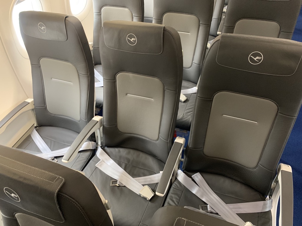 Ansonsten erinnern die Sitze sehr an die aktuelle Europakabine von Lufthansa. Wenn man von der etwas kantigeren Formgebung absieht, sind die Sitze fast identisch. So wurde die Literaturtasche auch hier nach oben verlegt um den Passagieren mehr Beinfreiheit zu bieten.