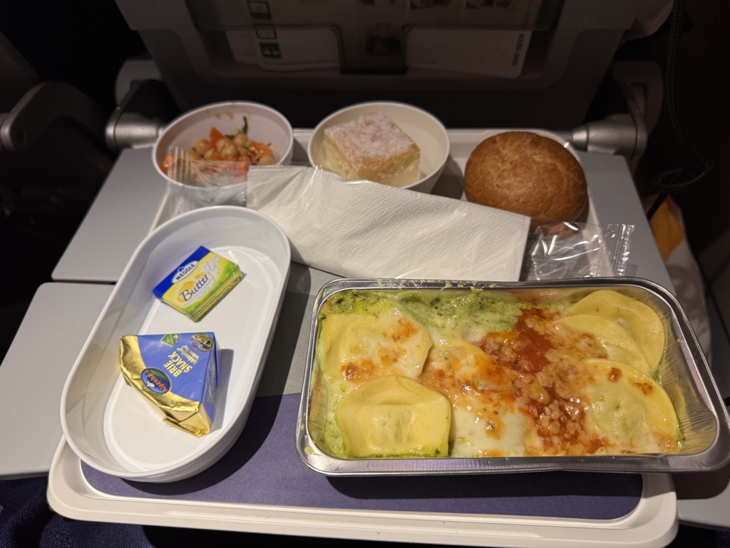 Was erwartet man in der Economy Class für ein Catering? Diese Frage habe ich mir wirklich vorher gestellt und mich auf ein mäßig schmeckendes Essen eingestellt. Aber der Reihe nach. Knapp 2 Stunden nach der Landung hatte ich ein erstes Getränk und Cracker, welche mir geschmeckt haben. Etwa eine Stunde später entschied ich mich für das vegetarische Gericht „Teigtaschen mit Spinat“. Das Essen kann mit einem guten Restaurant nicht mithalten, aber es hat mir geschmeckt und das ist doch die Hauptsache. Auch der Salat war total in Ordnung, den Kuchen habe ich nicht probiert, davon bin ich aber generell kein Fan. Auch die Optik fand ich total in Ordnung, wesentlich besser als erwartet.