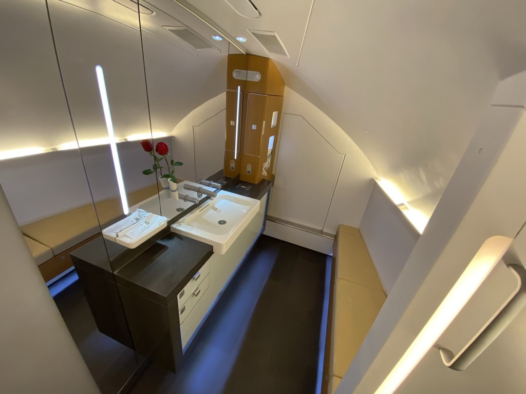 Rechts und links vor der First Class Kabine sind zwei Badezimmer verbaut, die ausschließlich für die First Class vorgesehen sind. Hier hat man auch durchaus ausreichend Platz um sich umzuziehen, auch wenn sie nicht ganz so großzügig wie die neuen First Class Bäder von Singapore Airlines, Emirates oder Thai sind. Da man im Badezimmer für gewöhnlich sowieso nur nötige Dinge erledigt und die kürzeste Zeit des Fluges verweilt, war es für uns absolut ausreichend.