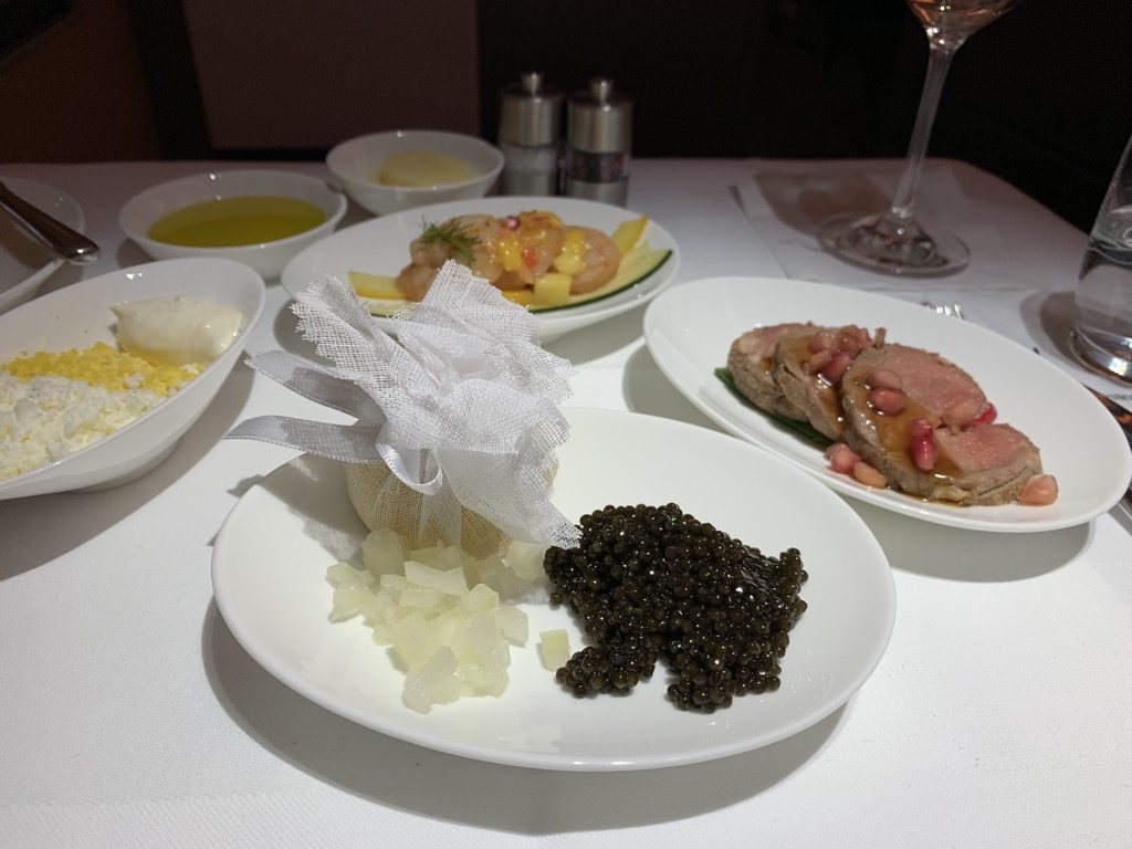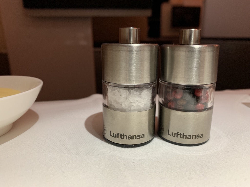 Direkt nach dem Start wurde mit dem Eindecken des Tisches begonnen. Hier freue ich mich immer besonders über die hübschen Salz- und Pfefferstreuer. Eine verrückte Kleinigkeit, die mich immer wieder erfreut. Begonnen wurde mit dem Lufthansa typischen Kaviar Gang, leider immer noch ohne Perlmutt Löffel, den Christoph immer vermisst. Dennoch hat der Kaviar sehr gut geschmeckt und war schön präsentiert.