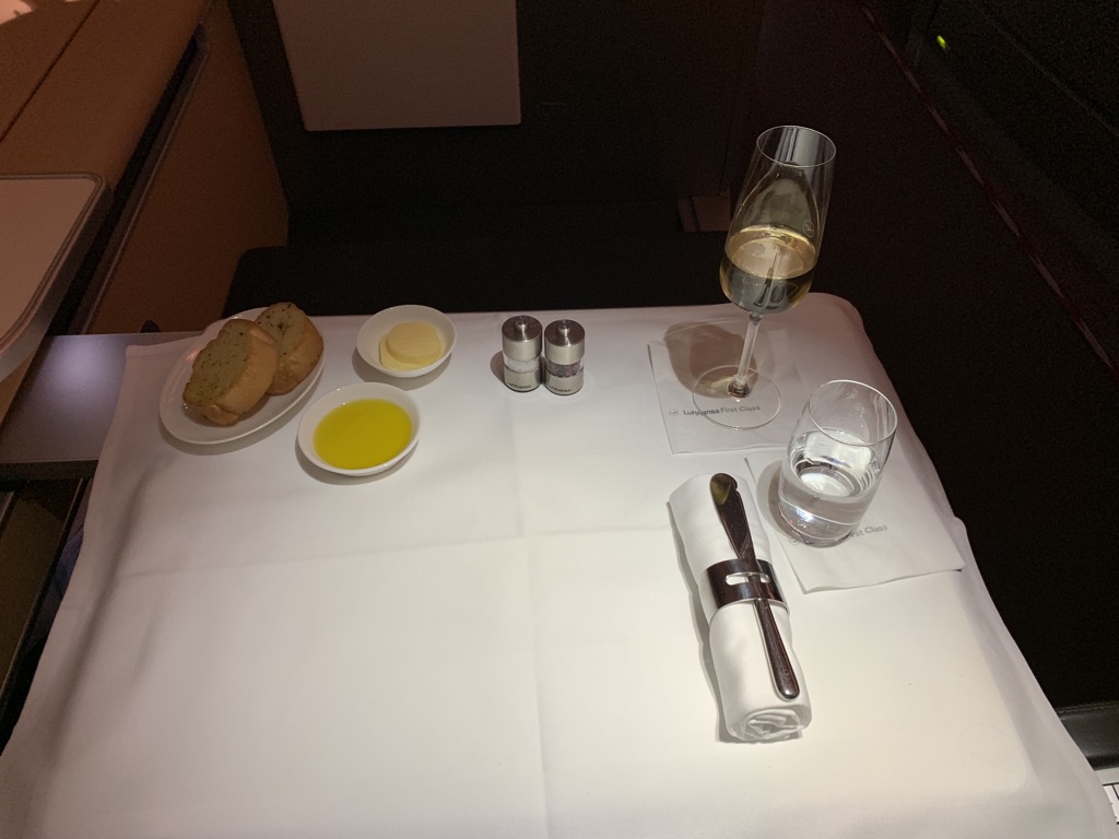 in der First ist das eigentlich egal. Wir haben sowohl bei einem Flug in der Mitte als auch an den Fenstern gut geschlafen. Da Christoph nichts mehr essen wollte, sondern sich direkt schlafen legen wollte, entschieden wir uns für die Fensterplätze, weil ich unglaublich gerne am Fenster sitze. Wäre er noch länger wach geblieben, hätten wir vermutlich eher die Plätze in der Mitte gewählt.