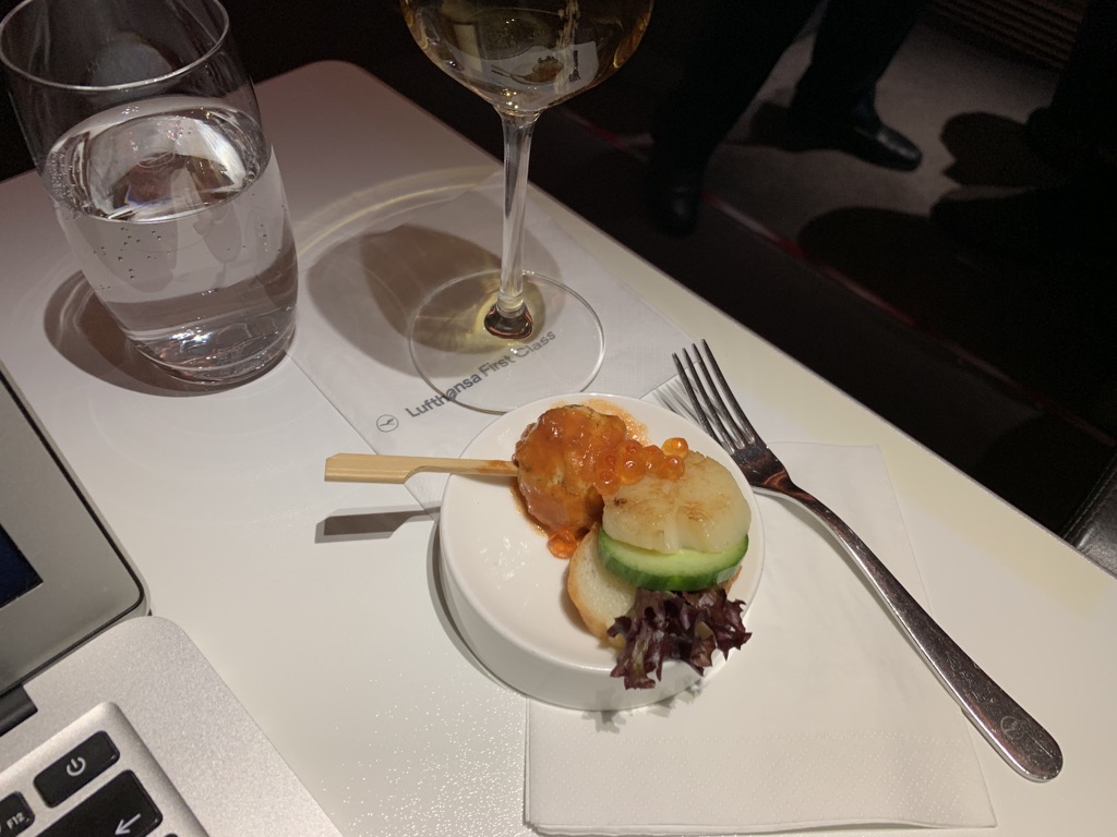 Direkt nach dem Einsteigen wurden wir herzlich begrüßt und nach unseren Getränkewünschen zur Begrüßung gefragt. Christoph freute sich bereits auf den Champagner, ich war mit einem Wasser glücklich. Hierzu wurde ein heißes Tuch und ein Amuse Gueule gereicht, welches uns beiden geschmeckt hat.
