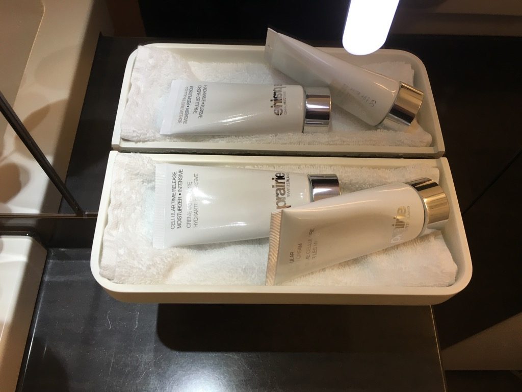In den Schubladen neben dem Waschbecken liegen Kämme, RasiereR, Zahnbürsten und Abschminktücher bereit. Auch Hand- und Gesichtscreme von la Prairie findet man in beiden Badezimmern.