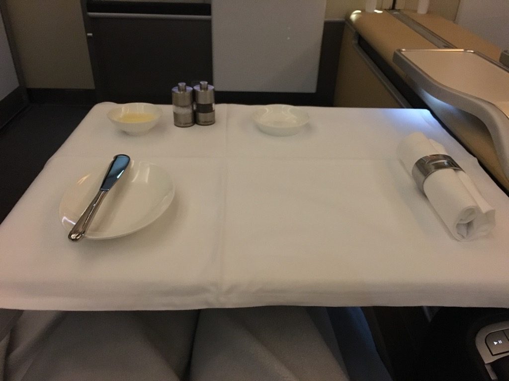 Direkt nach dem Amuse Bouche, wurden die Tische eingedeckt. Das Set Up in der Lufthansa First Class ist hier grundsätzlich recht schlicht.